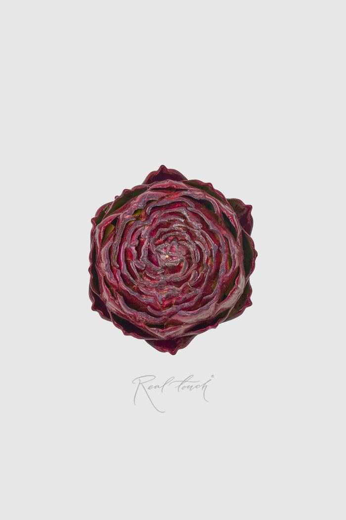 Плоский артишок - это тот же круглый, но со срезом сверху, который визуально похож на срез капусты, невероятно реалистичный, хочется потрогать, потереть и проверить сочный он или нет! В офисе привлекает внимание всех клиентов, без исключения. Состоит также из листьев-чешуек. Артишоки представлены в бордовом, зелено-розовом и бордово-зеленом цвете. Цвет листьев не однотонный, а с красивыми переливами, которые создают интересные и привлекательные цветовые комбинации. Плоский артишок выглядит очень стильно и элегантно.
