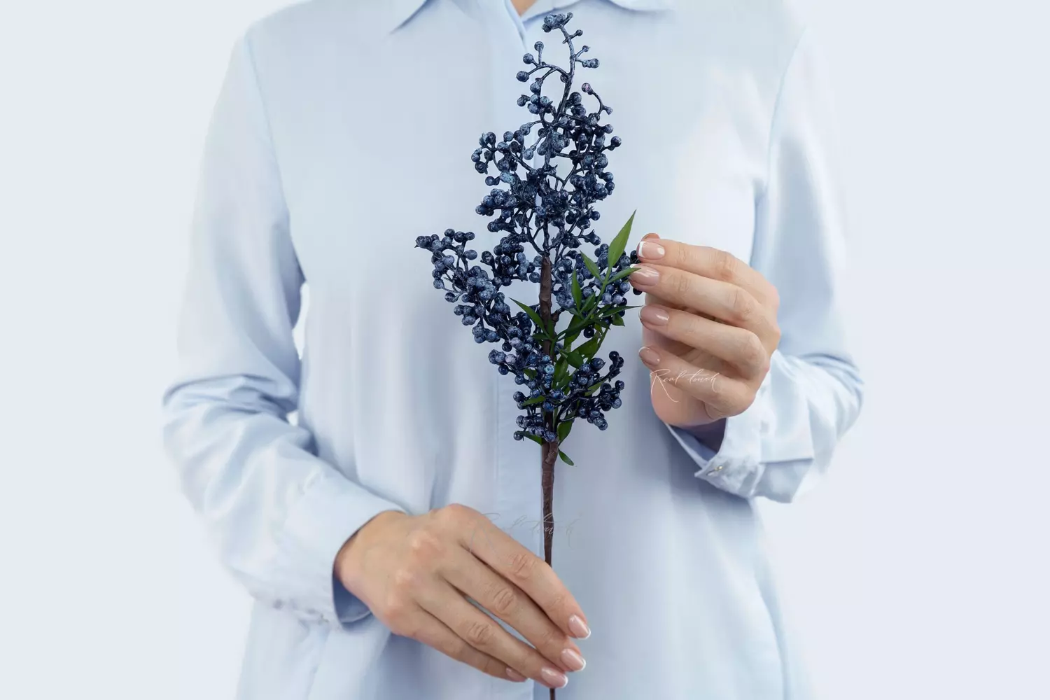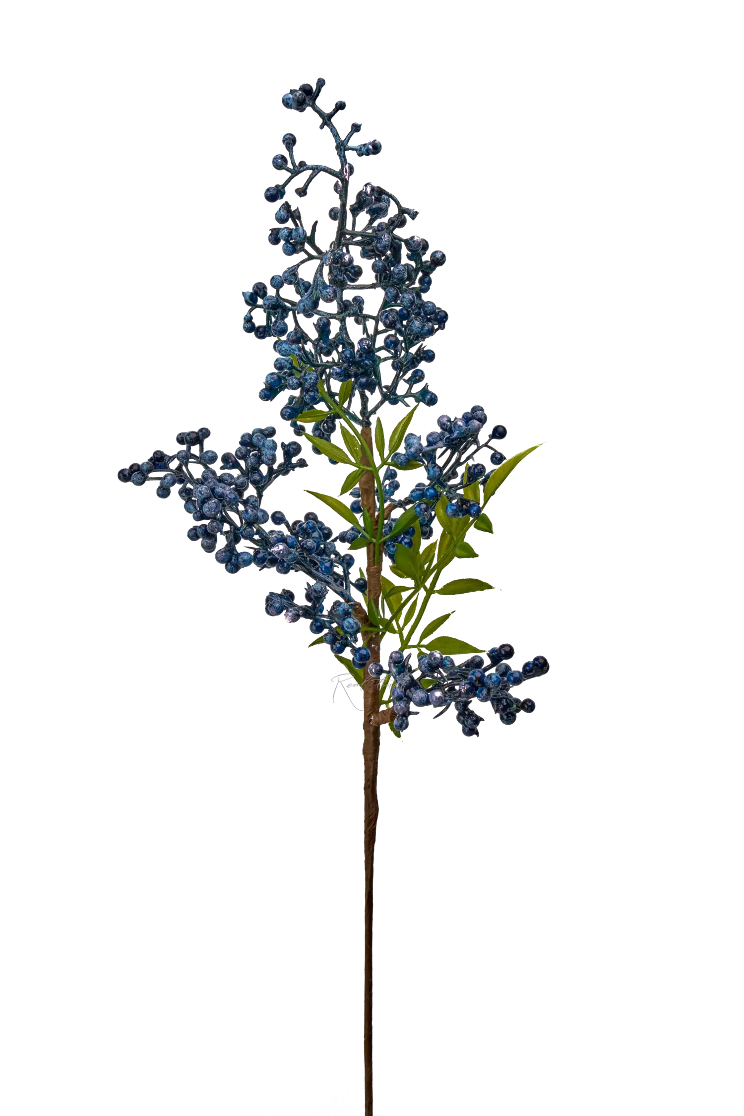 Длина стебля - 28,5 см., у стебля есть 3 отростка с пучками мелких ягод, листья из мягкого пластика, ягоды сделаны из пенопласта, имеют насыщенные красный и синие цвета. Внутри стебля расположена проволока, которая позволяет сгибать растение в любые стороны. У синей веточки в окрасе имеются более темные оттенки и светлые (голубой с вкраплениями розового). Красный цвет более глянцевый и однородный. Ягоды как после дождя.