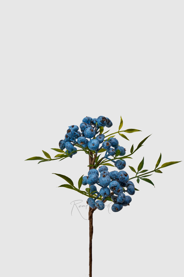 Снежноягодник представлен в четырех цветах: синий, красный, зеленый, белый. Длина стебля - 21 см., у стебля есть 2 отростка с пучками ягод по 7 штук. Стебель в бумажной оплётке, в его основании есть проволока, позволяющая гнуть ветку в любые стороны. Листья сделаны из мягкого пластика, а ягоды мягкие, из пенопласта. На ощупь они гладкие, в окрасе есть акварельные разводы, которые делают ягоды более реалистичными. Высота стебля до ответвлений с ягодами - 15 см. Несмотря на множество ягод, ветка не тяжелая. Отлично подойдут для новогоднего оформления.