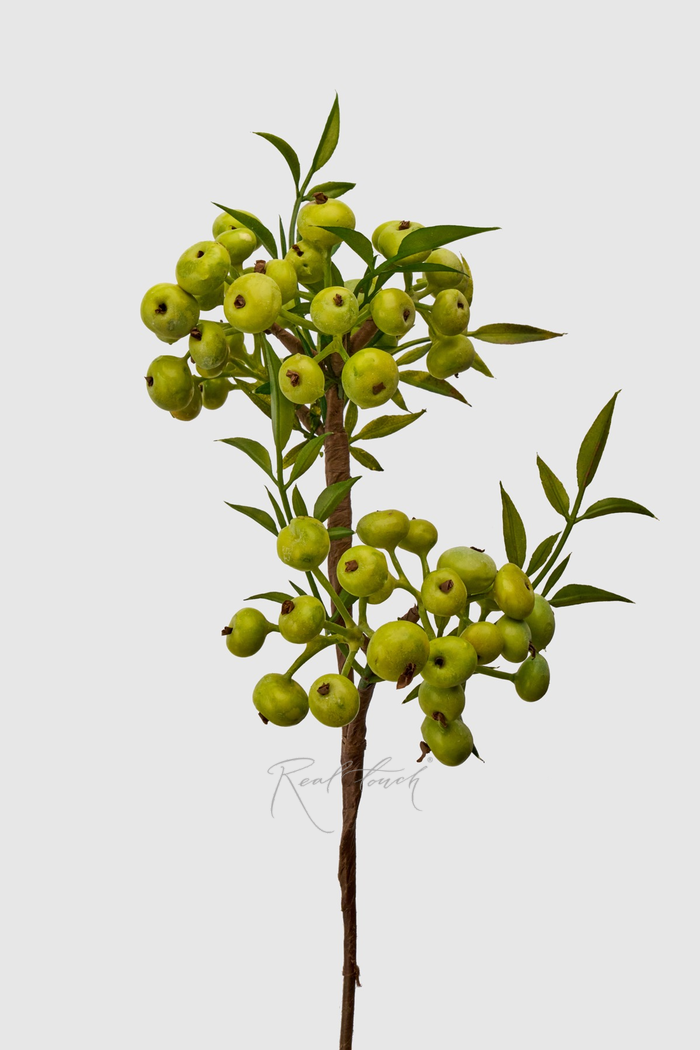 Снежноягодник представлен в четырех цветах: синий, красный, зеленый, белый. Длина стебля - 21 см., у стебля есть 2 отростка с пучками ягод по 7 штук. Стебель в бумажной оплётке, в его основании есть проволока, позволяющая гнуть ветку в любые стороны. Листья сделаны из мягкого пластика, а ягоды мягкие, из пенопласта. На ощупь они гладкие, в окрасе есть акварельные разводы, которые делают ягоды более реалистичными. Высота стебля до ответвлений с ягодами - 15 см. Несмотря на множество ягод, ветка не тяжелая. Отлично подойдут для новогоднего оформления.