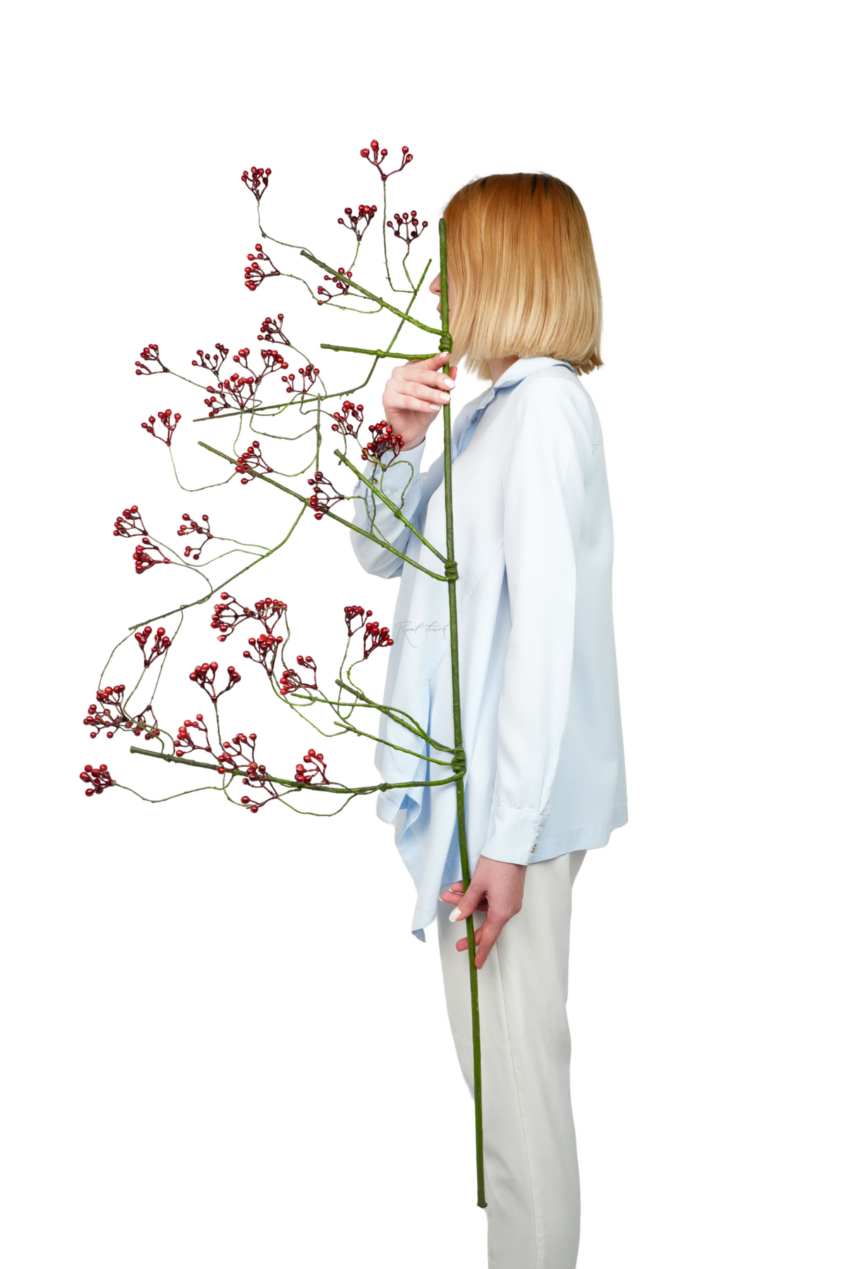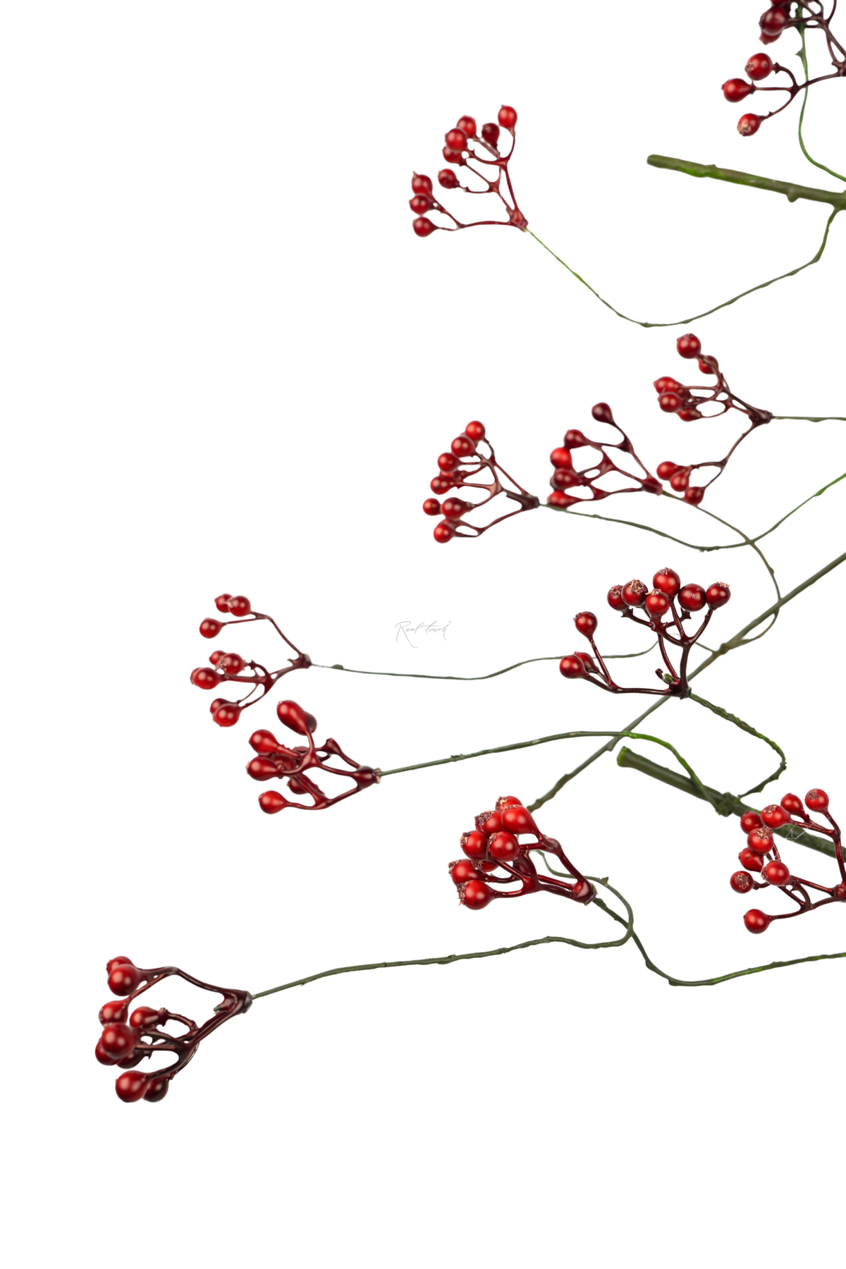 Ветка с ягодами гибкая - ветка выполнена из прочного пластика с эластичными, тонкими ответвлениями, благодаря чему легко принимает нужную форму. Ягоды окрашены в насыщенный темно-красно оттенок, с лёгким естественным глянцем, что делает ветку максимально реалистичной. Каждая кисть аккуратно закреплена и не осыпается при формовке. Проволока внутри ответвлений позволяет гнуть и фиксировать направление веточек, создавая нужный объём или изгиб.