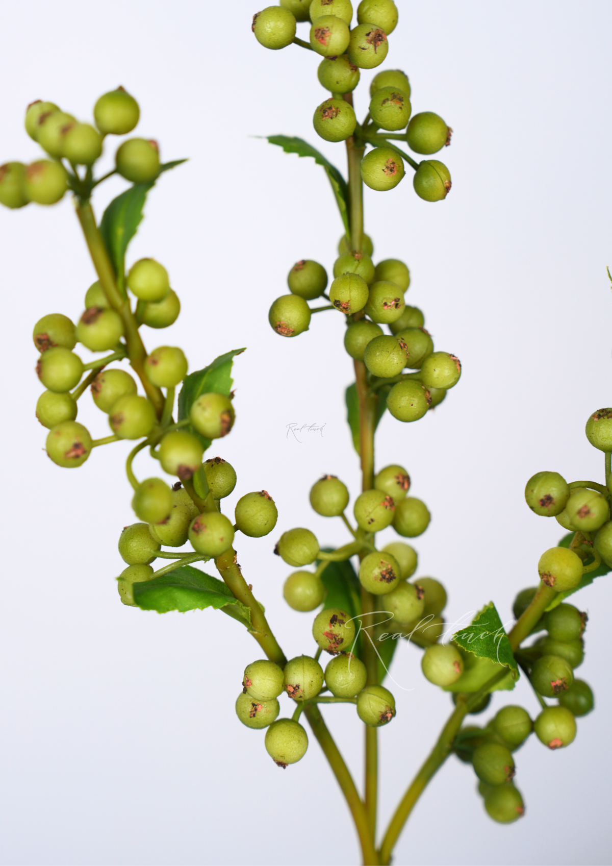 Ветка состоит из 3х ответвлений, которые усыпаны множеством плодов зеленого цвета, выполненных из плотного силикона. Также можно заметить, что окрас ягод неоднородный - некоторые плоды светлые, как будто еще неспелые. Помимо этого ветке придает большей реалистичности то, что на плодах заметны засохшие хвостики, точь-в-точь, как у настоящих ягод.