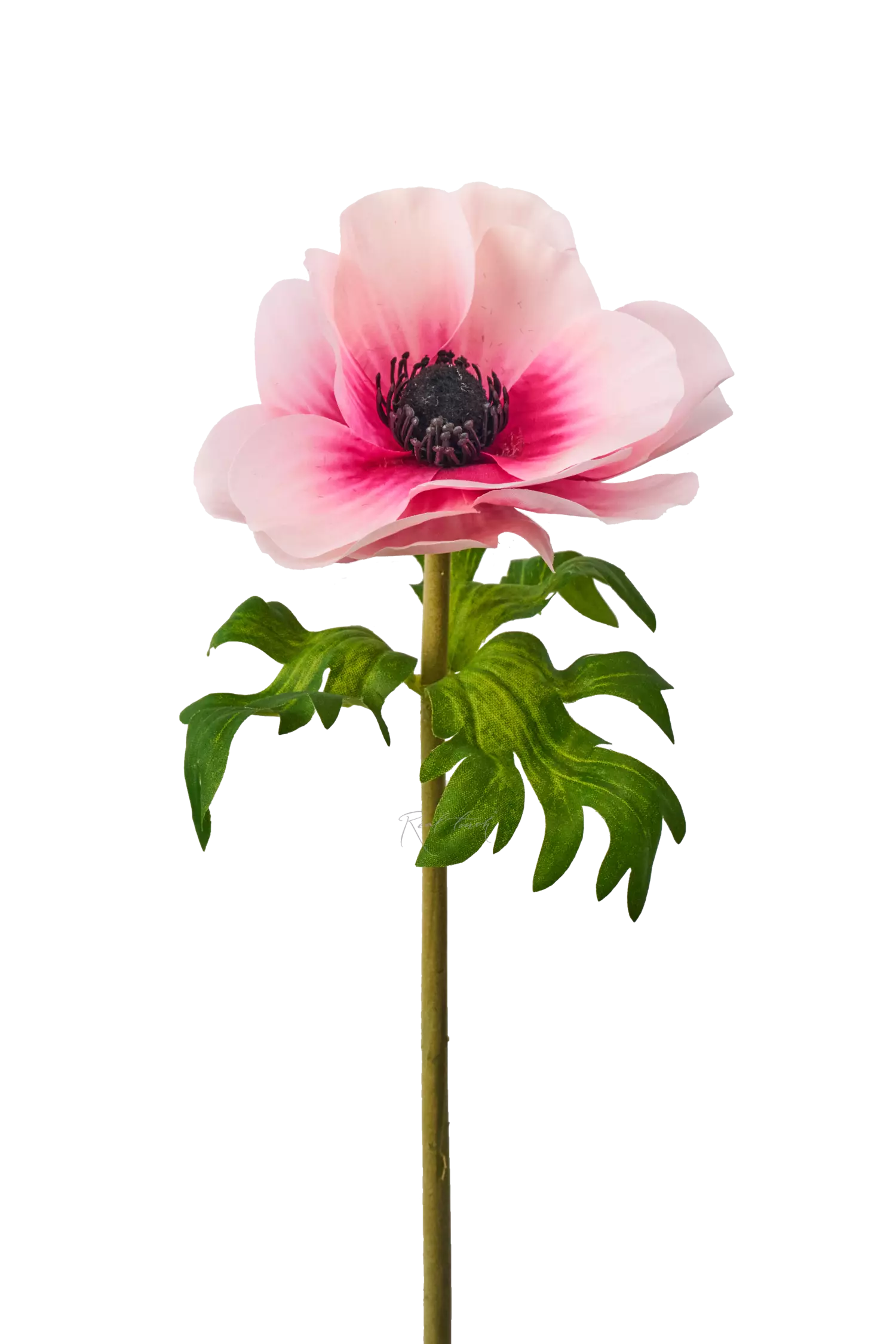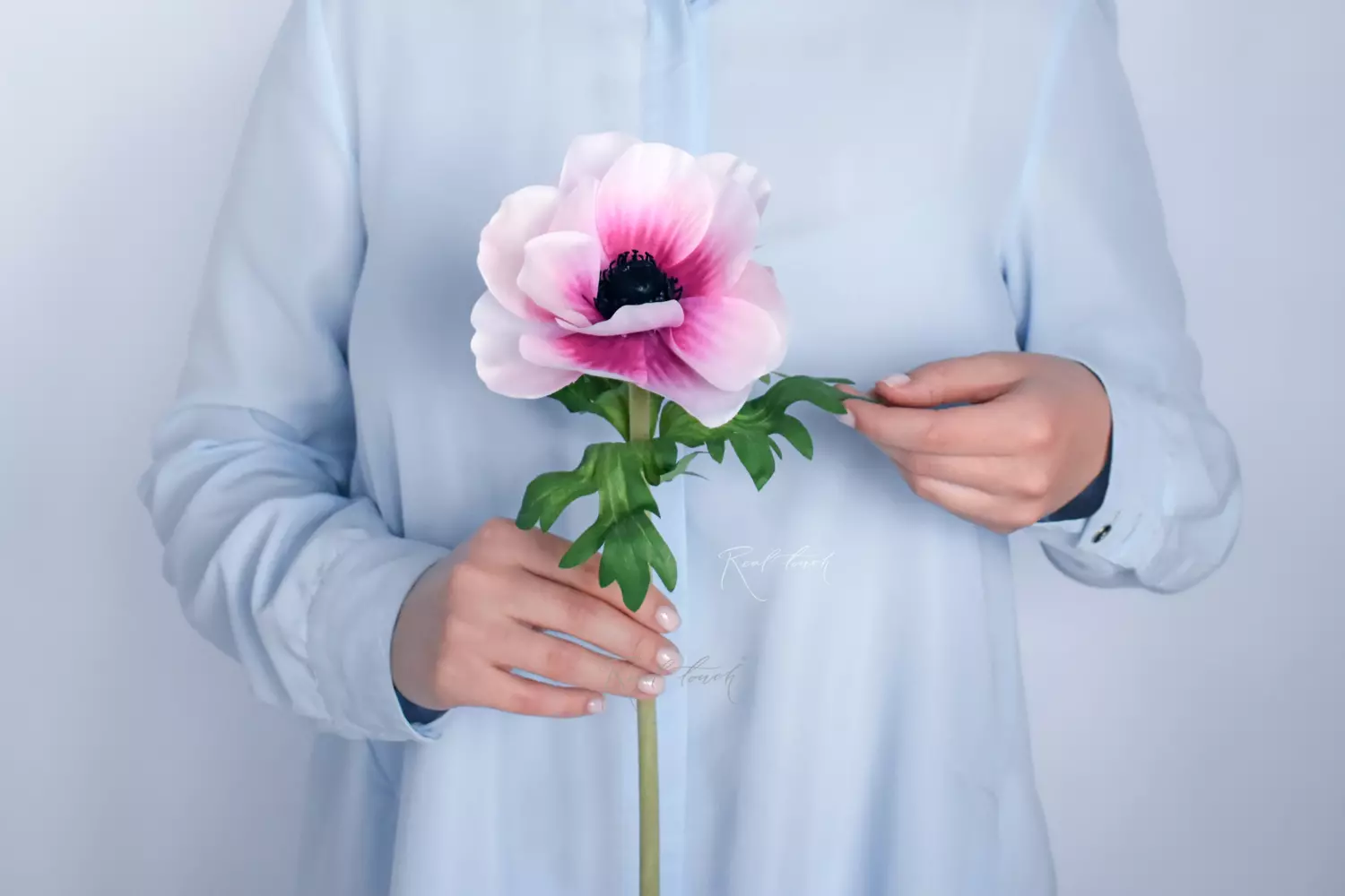 Анемон Де каен – это удивительный цветок, лепестки которого поражают своей яркостью и насыщенностью, создавая ощущение глубины и объема. Каждый цвет уникален и проработан до мельчайших деталей: градиент, прожилки, небольшие пятнышки или особый рисунок. Высота цветка 48см, диаметр бутона 12см. Стебель данного анемона достаточно толстый (порядка 1 см) и приятный на ощупь, словно махровый благодаря особому покрытию. Сердцевина черного цвета с ворсом, нанесенным методом флокирования. Благодаря такой сердцевине цветок контрастнее и, следовательно, выглядит значительно ярче и привлекательнее. Некоторые лепестки формованы, то есть на них есть бороздки с прожилками, и слегка подогнутые края.