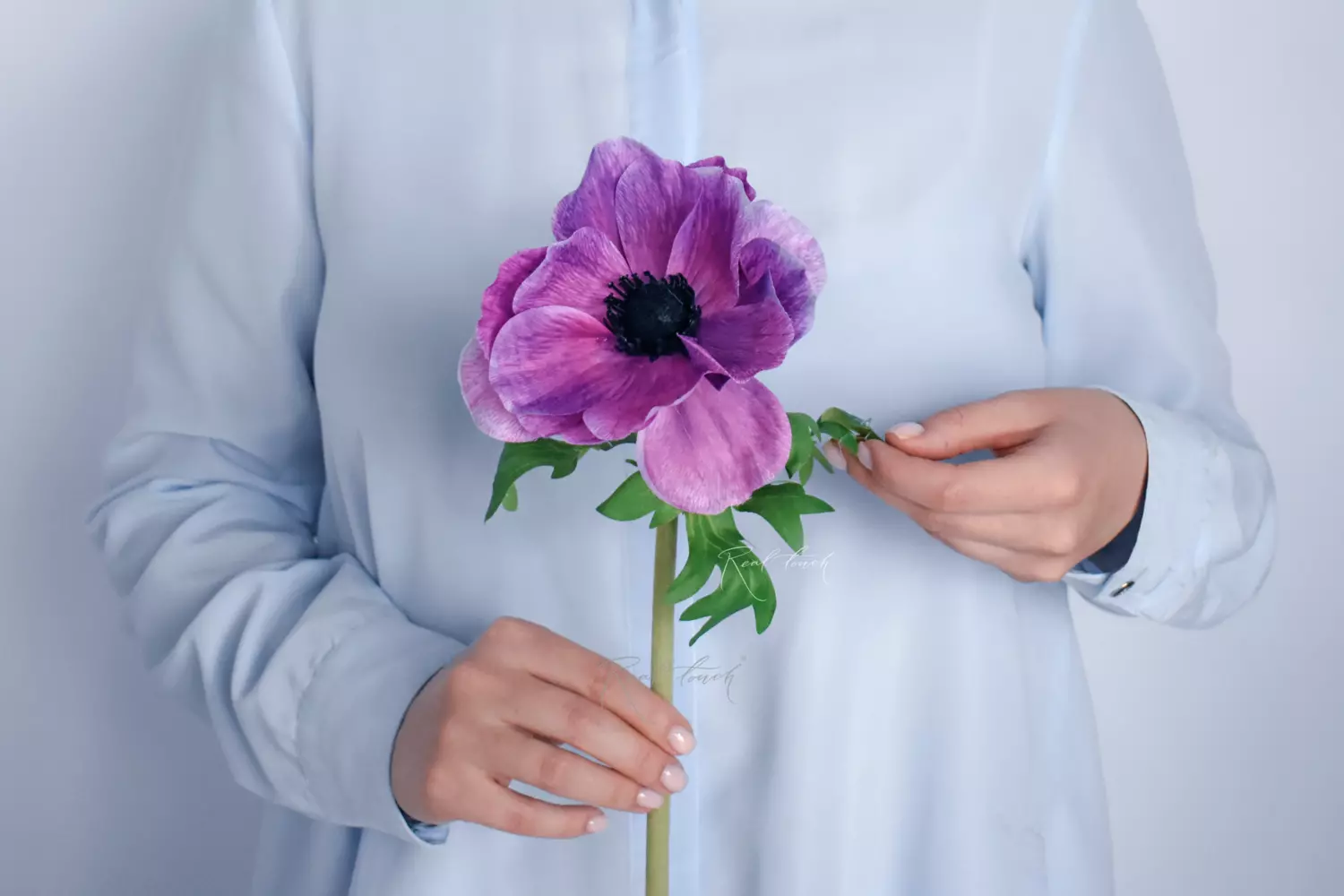 Анемон Де каен – это удивительный цветок, лепестки которого поражают своей яркостью и насыщенностью, создавая ощущение глубины и объема. Каждый цвет уникален и проработан до мельчайших деталей: градиент, прожилки, небольшие пятнышки или особый рисунок. Высота цветка 48см, диаметр бутона 12см. Стебель данного анемона достаточно толстый (порядка 1 см) и приятный на ощупь, словно махровый благодаря особому покрытию. Сердцевина черного цвета с ворсом, нанесенным методом флокирования. Благодаря такой сердцевине цветок контрастнее и, следовательно, выглядит значительно ярче и привлекательнее. Некоторые лепестки формованы, то есть на них есть бороздки с прожилками, и слегка подогнутые края.