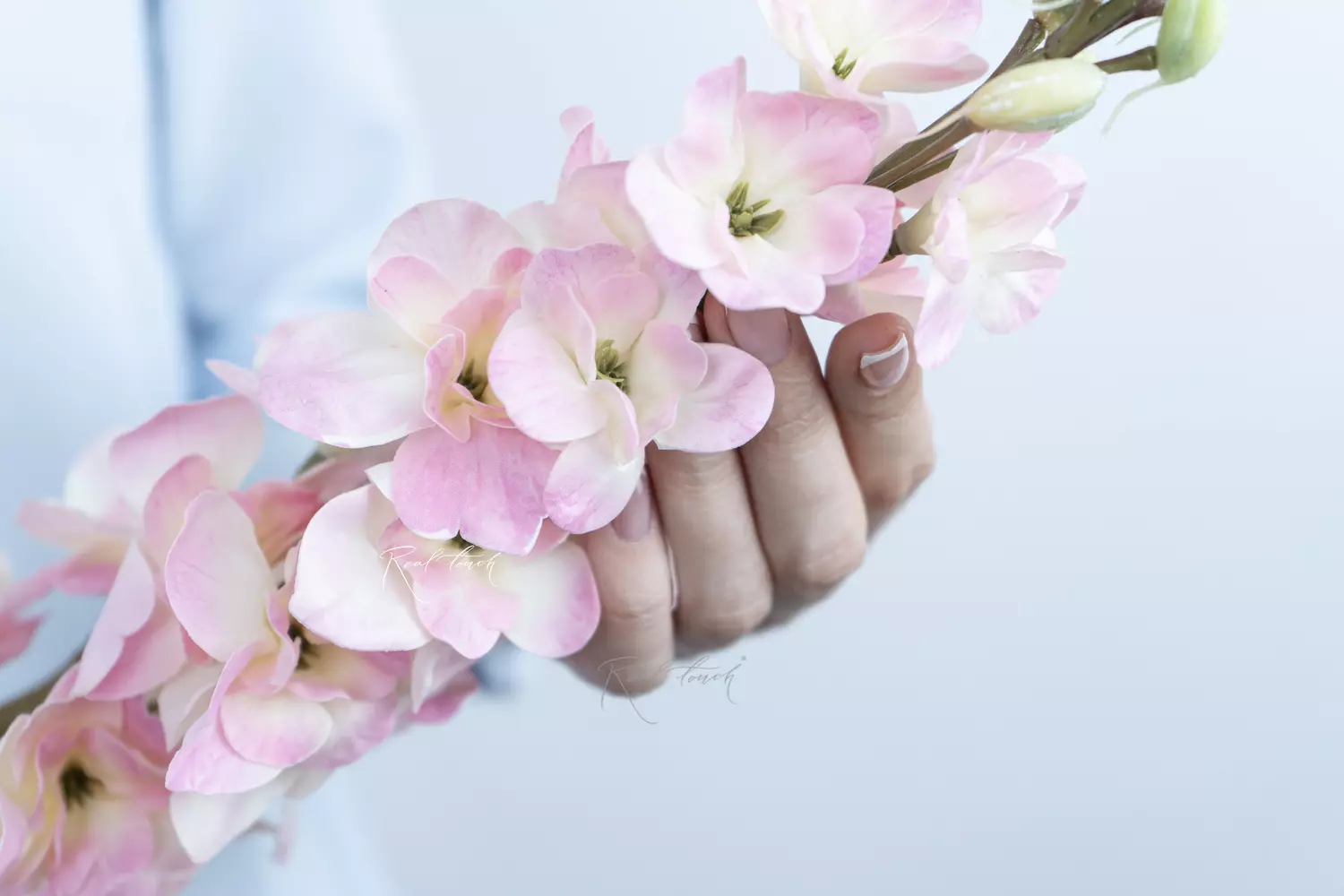 Дельфиниум малый — изысканная модель из ассортимента цветущих веток Real Touch, которая привлекает внимание своей нежностью и детальной проработкой.