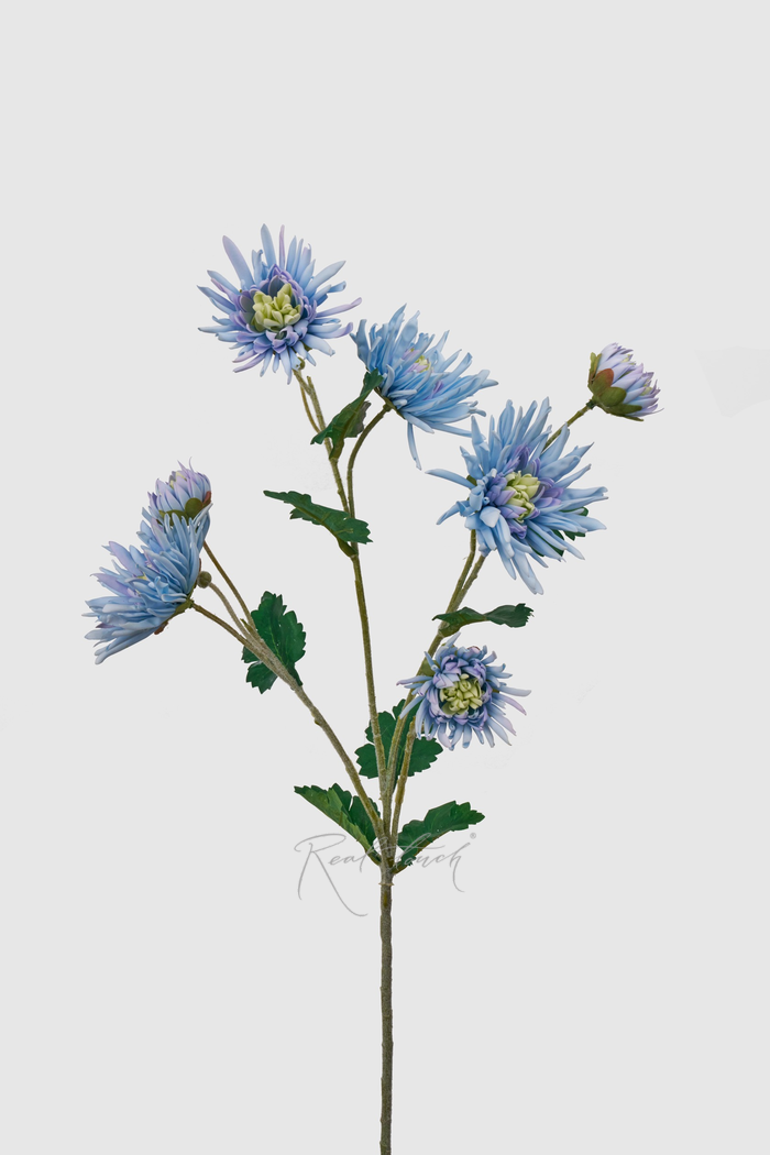Это нежные игольчатые хризантемы с разноразмерными плотными бутончиками. Высота ветки с цветами – 76см, соцветия диаметром от 3см до 9см, лепестки в центре собраны в плотный шарик, будто вот-вот распустятся, количество бутонов – 7 (включая 2 небольших). Соцветия выполнены из шелка с латексным покрытием, а листочки из текстиля (листочки можно слегка отпаривать после транспортировки). Стебель цветка с легким белесым мягким напылением, имитирующем ворсистость, в основании стебля есть проволока, доходящая до крупных соцветий. Благодаря проволоке цветочную ветку можно расправить и придать нужный объем и задать направление. Нежный голубой цвет с желто-зеленой сердцевинкой делают хризантему более очаровательной и реалистичной. Такая хризантема сможет удивить и стать прекрасным дополнением многих цветочных композиций.