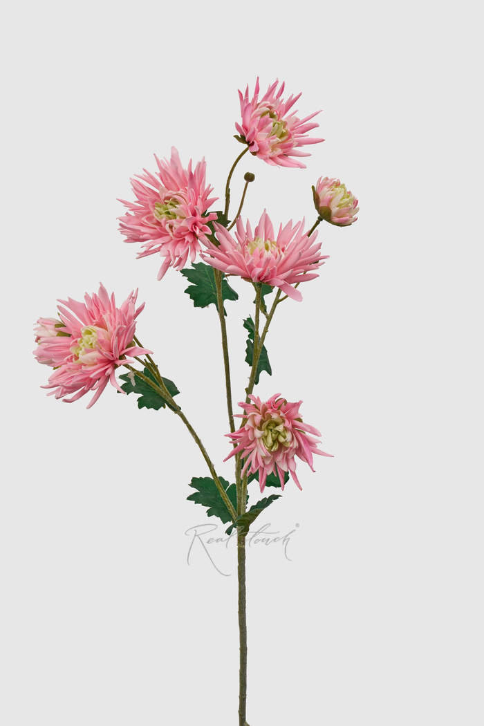 Это нежные игольчатые хризантемы с разноразмерными плотными бутончиками. Высота ветки с цветами – 76см, соцветия диаметром от 3см до 9см, лепестки в центре собраны в плотный шарик, будто вот-вот распустятся, количество бутонов – 7 (включая 2 небольших). Соцветия выполнены из шелка с латексным покрытием, а листочки из текстиля (листочки можно слегка отпаривать после транспортировки). Стебель цветка с легким белесым мягким напылением, имитирующем ворсистость, в основании стебля есть проволока, доходящая до крупных соцветий. Благодаря проволоке цветочную ветку можно расправить и придать нужный объем и задать направление. Пастельный розовый цвет бутонов с желто-зеленой сердцевинкой придают хризантеме особый утонченный вид. Такая хризантема сможет удивить и стать прекрасным дополнением многих цветочных композиций.