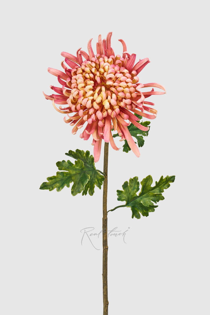 Хризантема выполнена из плотного силикона, который отлично держит форму каждого лепесточка. Внутри соцветия пластиковая сердцевина, а от нее, постепенно раскрываясь, идет множество рассыпчатых лепестков. Диаметр соцветия составляет 20 см. Лепестки приятные на ощупь, их хочется трогать, сжимать, перебирать в руках. Прокраска соцветия яркая, динамичная, с нежным градиентом от теплого кремового оттенка к розовому.