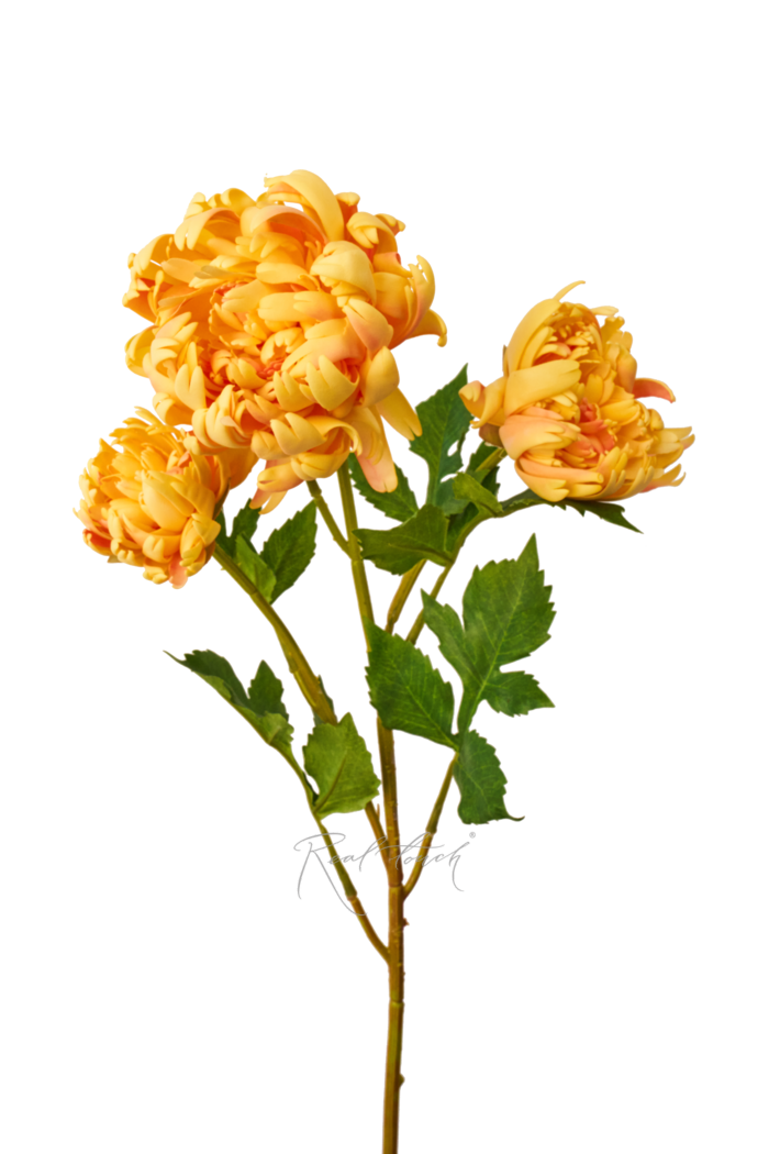 Хризантема Венский бал – представлена как отдельная веточка, так и в букете из 3-х бутонов, слегка напоминающих пион. Соцветия выполнены в новом материале – шелк с нанесением тонкого слоя пены с одной стороны. Данный материал придает лепесткам более плотную структуру, делая их мягче без излишней влажности. Нежные и элегантные «танцующие» лепестки словно обнимают в движении сердцевину цветка. Прокраска лепестков нежно-желтая и также встречаются лепесточки со светло-розовым градиентом. Данное решение позволяет воссоздать более естественный вид соцветий.