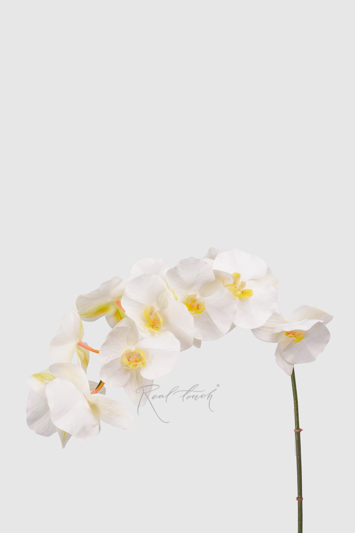 Новая орхидея Real Touch - это потрясающая ботаническая копия, отличительной особенностью которой является детальная проработка каждого цветка и очень приятная на ощупь, бархатистая, максимально приближенная к настоящему цветку по ощущениям, тактильная фактура лепестков. Лепестки выполнены из тонкого силикона, при этом существует формовка и, характерное для больших соцветий орхидей, ребро. Внутри соцветия сердцевина, выполненная из мягкого пластика с бело-желтым градиентом и реалистичным рисунком. Детальная зелено-коричневая печать с обратной стороны соцветий придает орхидее еще больше естественности.