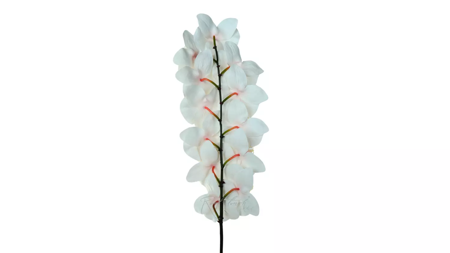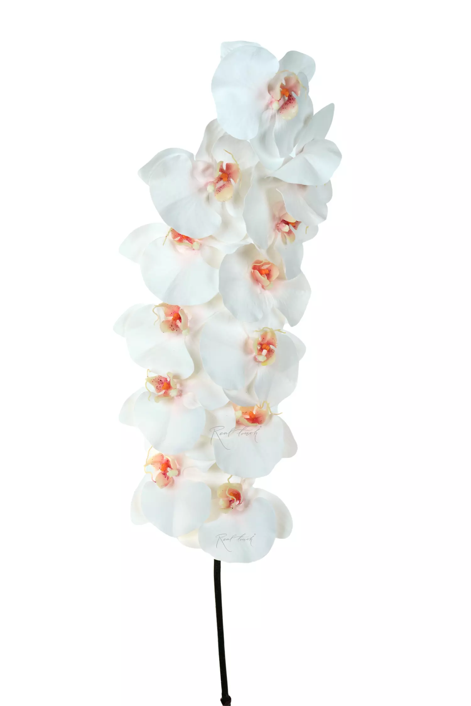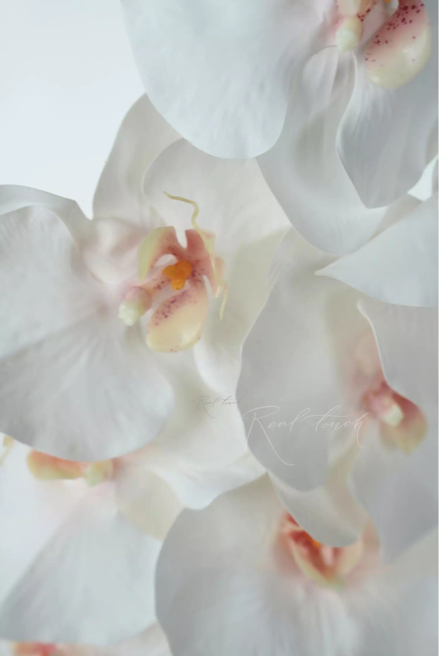 Новая орхидея Real Touch - это потрясающая ботаническая копия, отличительной особенностью которой является детальная проработка каждого цветка и очень приятная на ощупь, бархатистая, максимально приближенная к настоящему цветку по ощущениям, тактильная фактура лепестков. Лепестки выполнены из тонкого силикона, при этом существует формовка и, характерное для больших соцветий орхидей, ребро. Внутри соцветия сердцевина, выполненная из мягкого пластика с бело-розовым градиентом и реалистичным рисунком. Детальная зелено-коричневая печать с обратной стороны соцветий придает орхидее еще больше естественности.