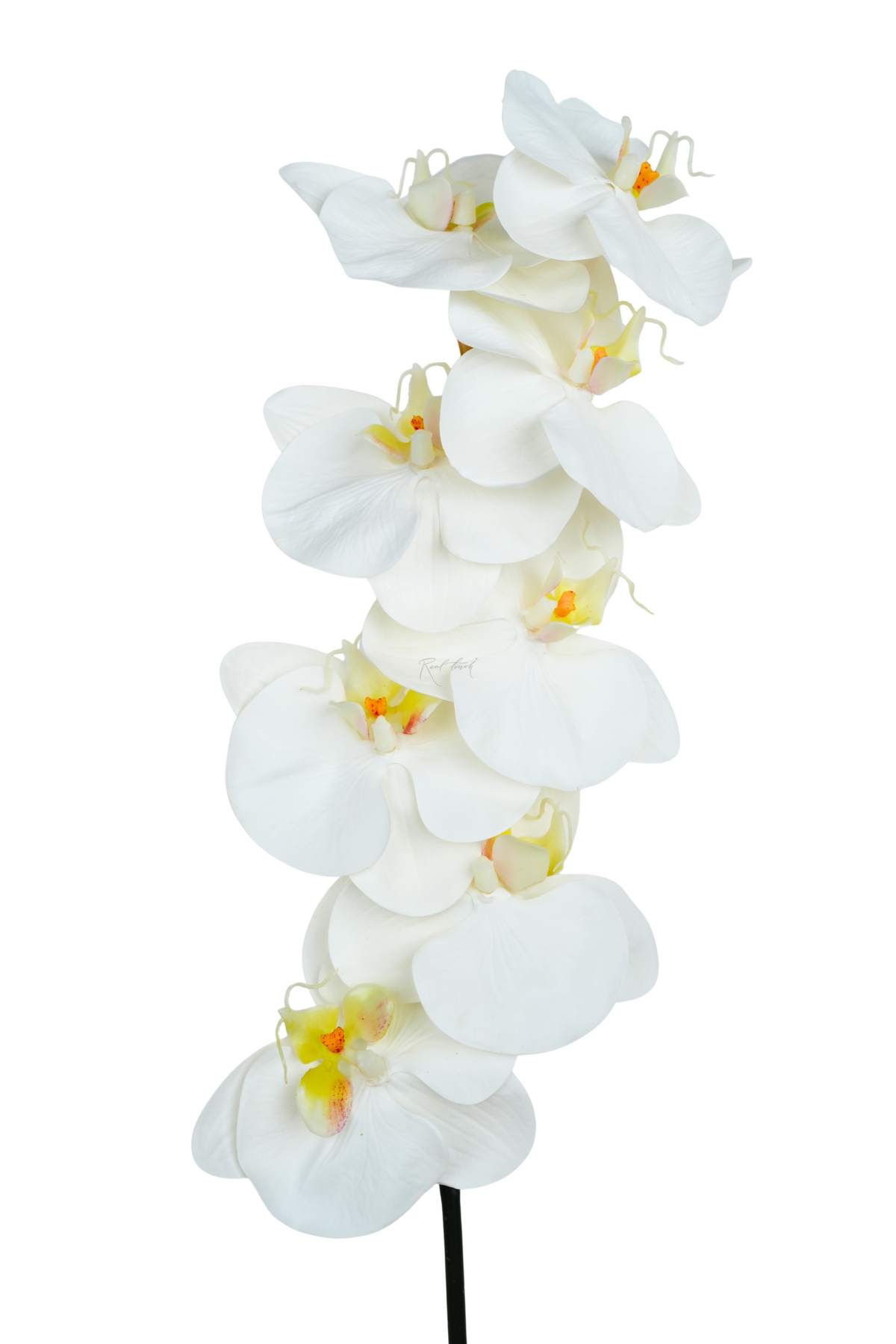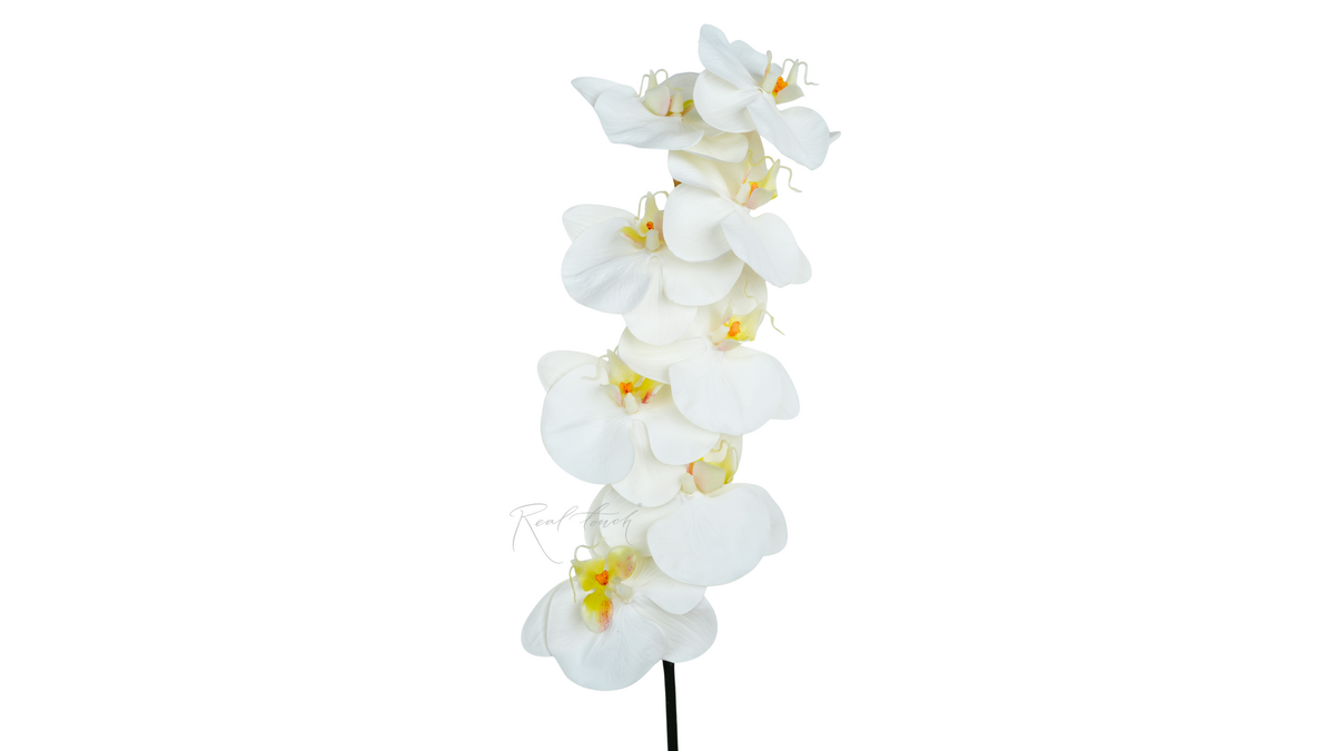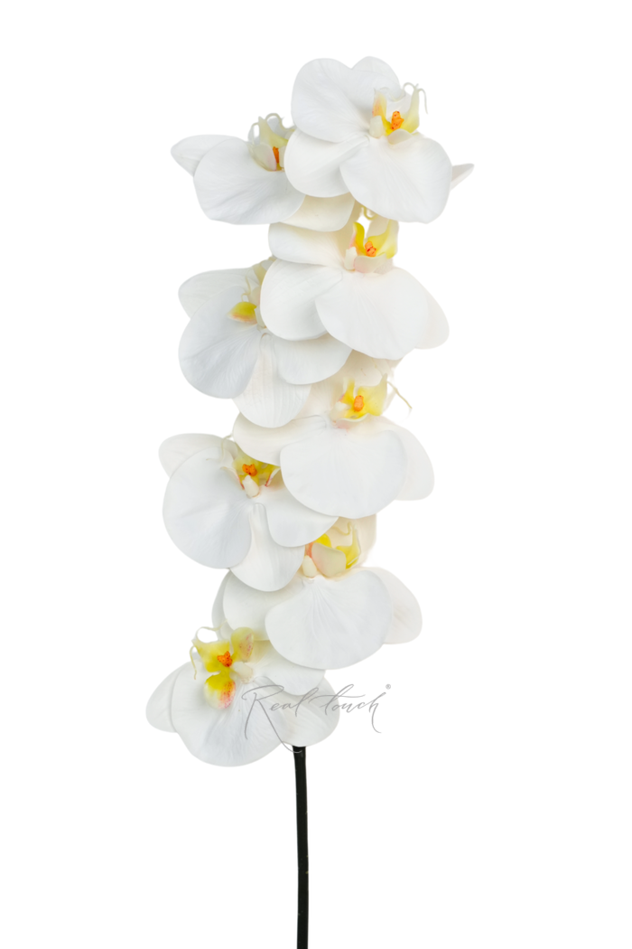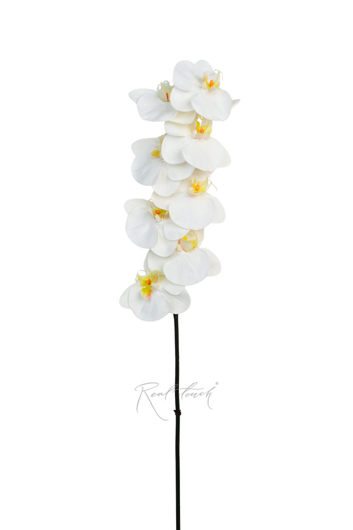 Новая орхидея Real Touch - это потрясающая ботаническая копия, отличительной особенностью которой является детальная проработка каждого цветка и очень приятная на ощупь, бархатистая, максимально приближенная к настоящему цветку по ощущениям, тактильная фактура лепестков. Лепестки выполнены из тонкого силикона, при этом существует формовка и, характерное для больших соцветий орхидей, ребро. Внутри соцветия сердцевина, выполненная из мягкого пластика с бело-желтым градиентом и реалистичным рисунком. Детальная зелено-коричневая печать с обратной стороны соцветий придает орхидее еще больше естественности.