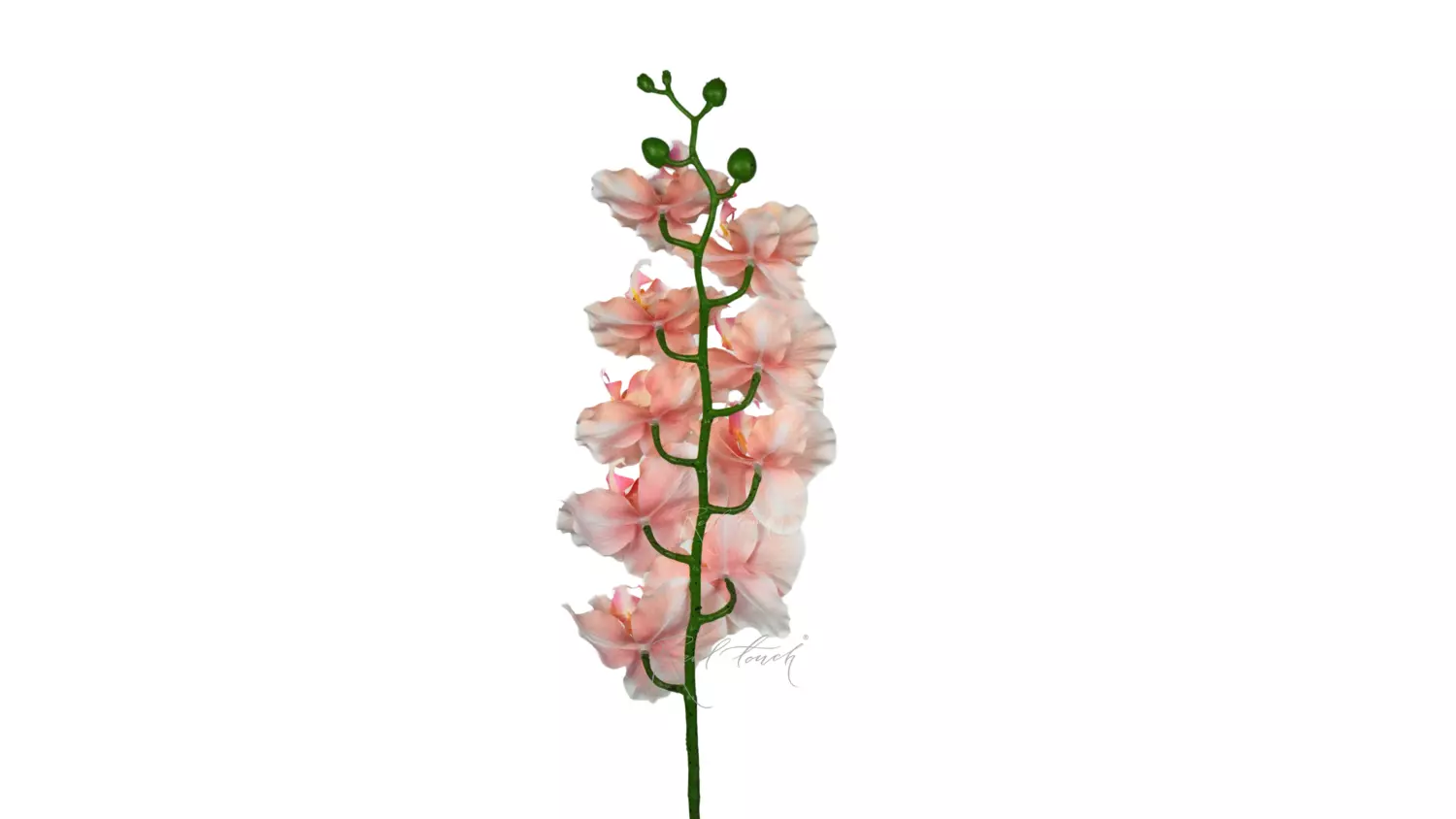 Стебель выполнен из пластика, внутри которого идет проволока, позволяющая задать растению различные изгибы и направления. По всей длине стебля нанесены вкрапления черно-коричневого цвета.Также у данной орхидеи заметны плавно переходящие ответвления от стебля к соцветиям и бутонам.
