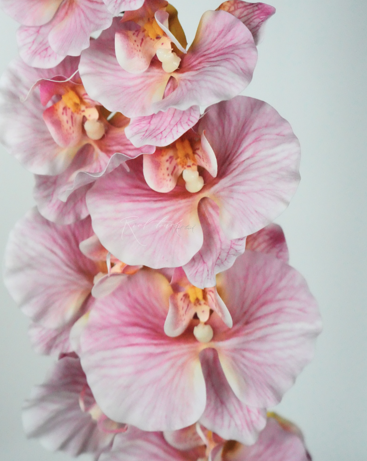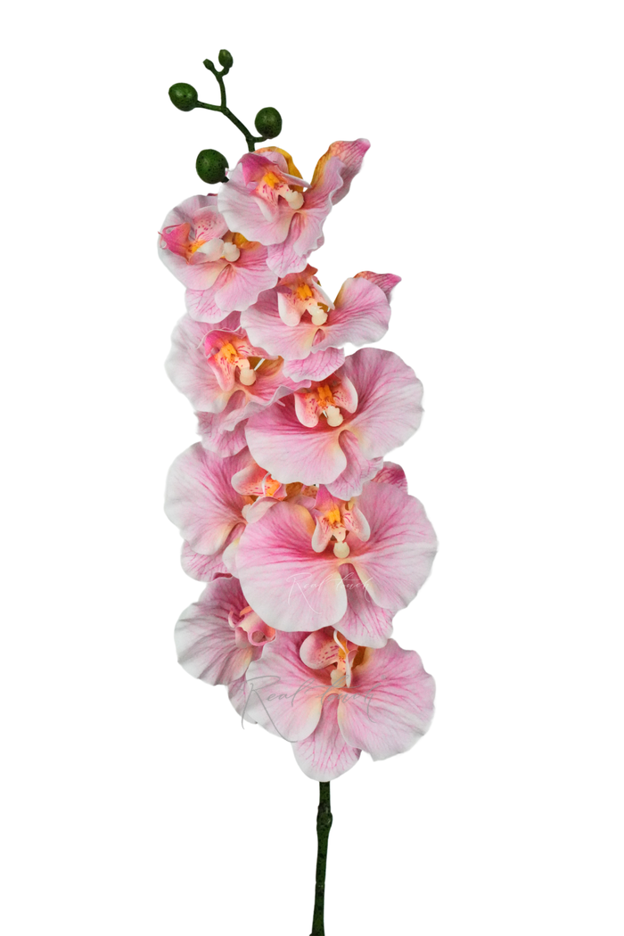 Каждый лепесток идет с 3D печатью ярко-розовых прожилок, которые точь-в-точь повторяют натуральные лепестки орхидеи. Лепестки, как и всё соцветие, выполнены из силикона с едва заметными усилителями на внутренней стороне, при этом существует формовка, которая характерна для данной орхидеи. Также у лепестков имеется тактильный рельеф и волнистые края, что придает им еще больше легкости и нежности. В центре соцветия имеется розовая сердцевина. От сердцевины по всему соцветию идет легкий градиент от темно-розового к белому цвету. Соцветия имеют разный размер и идут диаметром от 8 см до 11 см.