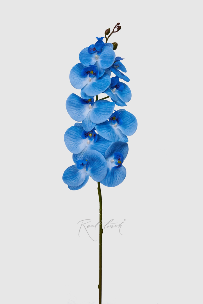 Лепестки данной орхидеи немного плотнее, также присутствует Soft-touch покрытие, поэтому на ощупь орхидея кажется более приятной, нежной и качественной. Каждый лепесток идет с 3D печатью прожилок, что также делает каждое соцветие приятным, бархатистым, тактильно реалистичным. Лепестки выполнены из силикона с едва заметными усилителями, при этом существует формовка, характерная для всех соцветий орхидей. Внутри соцветия сердцевина, выполненная из пластика. От сердцевины по всему соцветию идет легкий градиент от белого к голубому. Соцветия идут диаметром от 8 см до 11 см, от меньшего сверху к большего снизу.