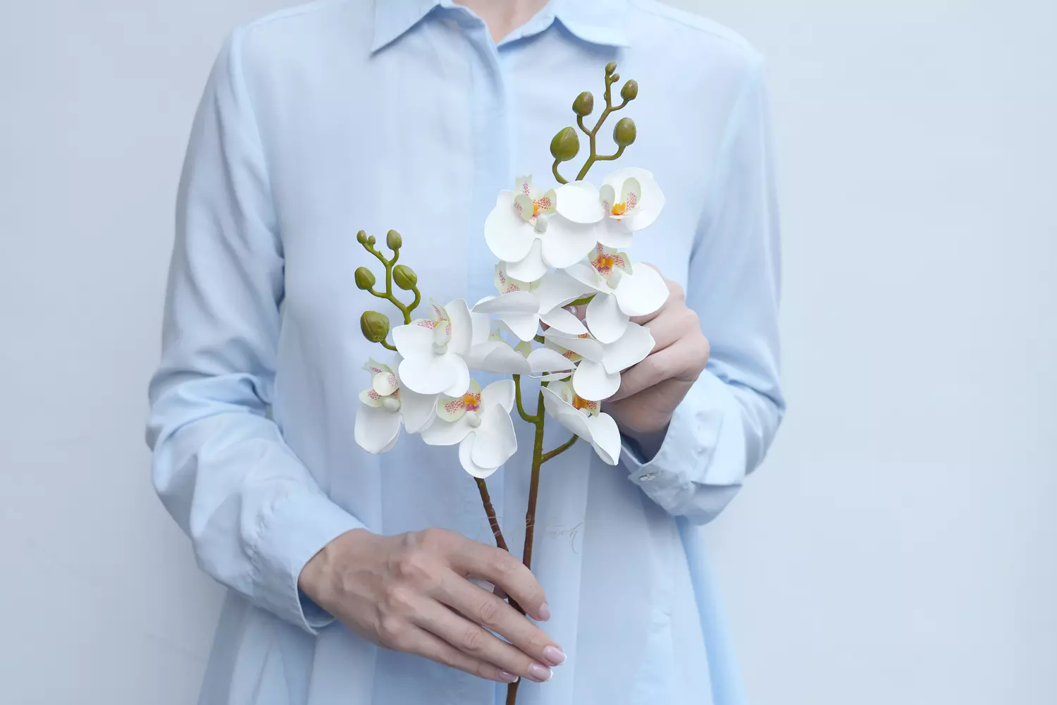 Третий вид хорошо подойдут для свадьбы, когда не нужны яркие акценты, она чисто-белая, нижний лепесток выполнен также из силикона без нанесения краски. Даже тычинки белая, а не жёлтая, как в классической модели. Орхидея обладает характерным стеблем с проволокой в основе. Цветочная часть - 22см.