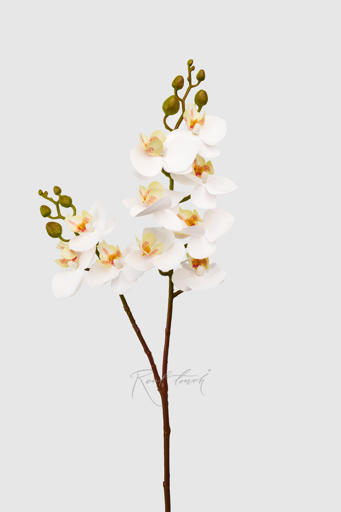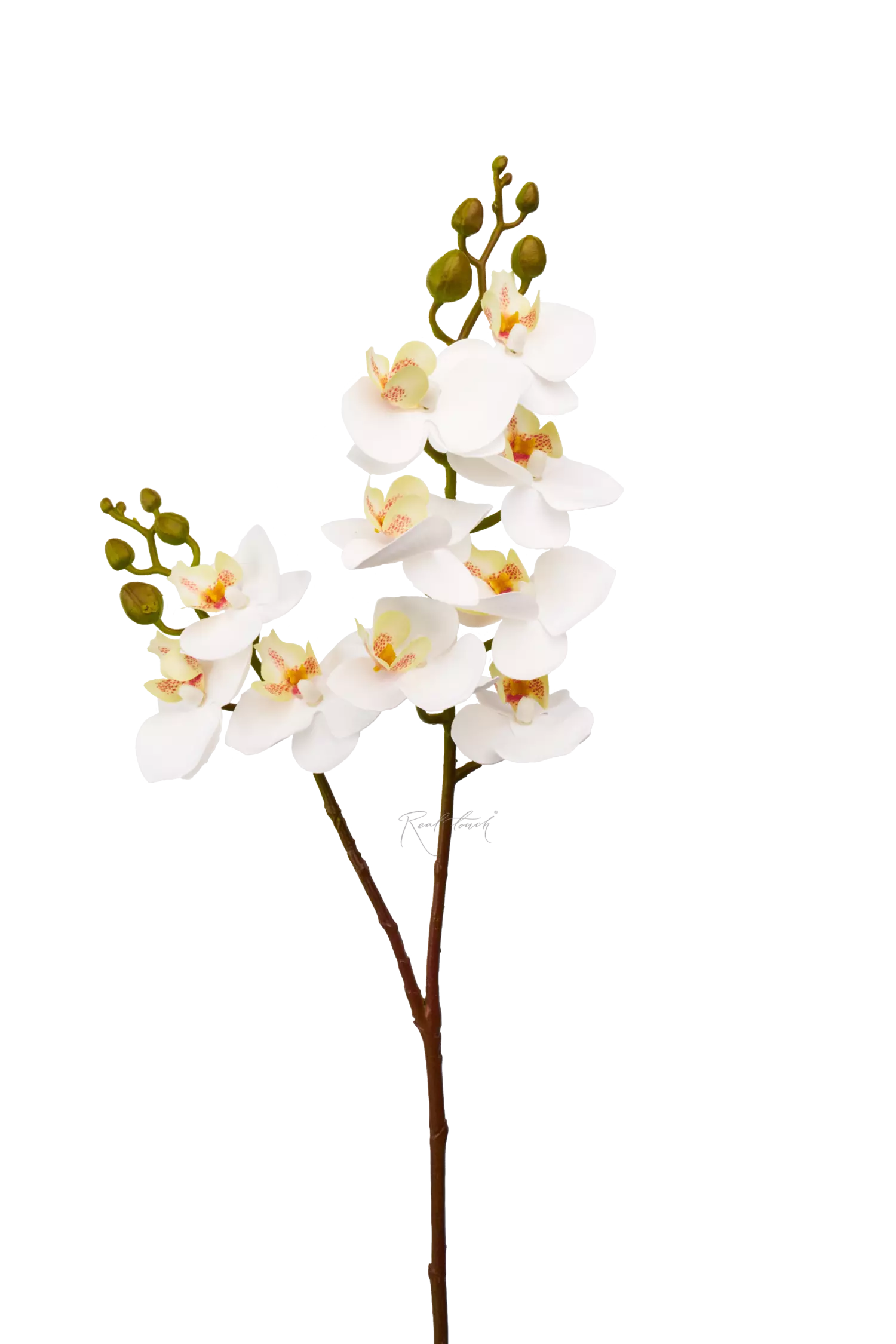 У нас часто спрашивают небольшие орхидеи фаленопсис, потому мы для вас подготовили 4 разные модели. Они все выполнены из силикона, отличаются цветом, количеством соцветий и их размером. Первый вид орхидея совсем малышка, состоит из 5 соцветий, диаметр самого большого 6,5см. Высота орхидеи 56см, цветочная часть 18см. Внутри стебля металлическая проволока. Как и у классической нашей орхидей нижний лепесток жёлтого цвета выполнен из текстиля. Сама орхидея белая с гладкими прохладными силиконовыми лепестками.