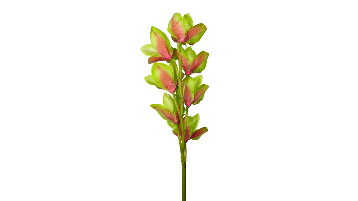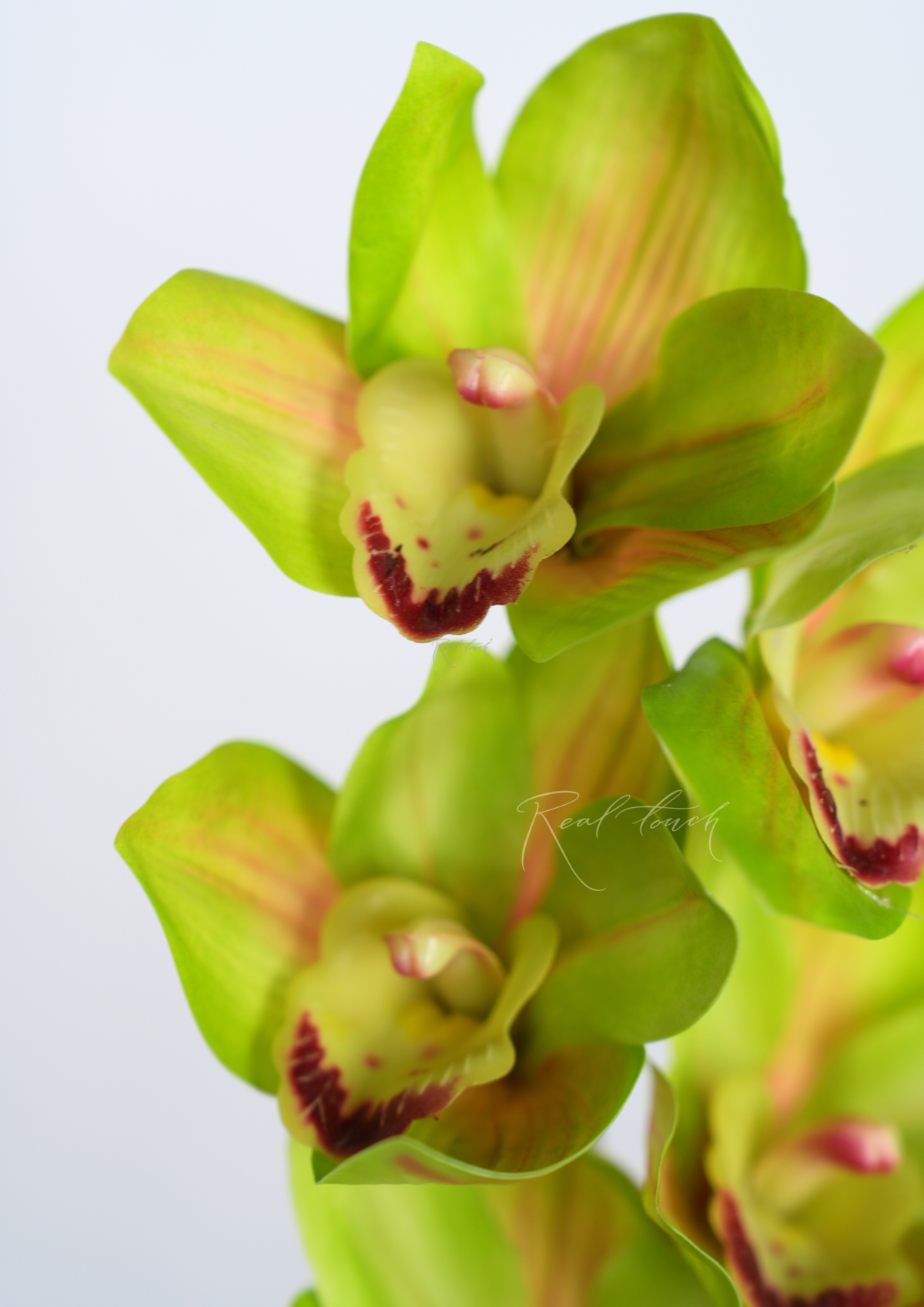 Данная позиция состоит из 7 насыщенных зеленых соцветий, выполненных из водонепроницаемого полимерного волокна с 3D печатью прожилок. Внутри соцветий есть сердцевина из плотного силикона. Лепестки мягкие, приятные на ощупь, что придает цимбидиуму тактильную реалистичность. Кроме этого, на себя обращает внимание окрас лепестков: плавный градиент зеленого и розового цветов.