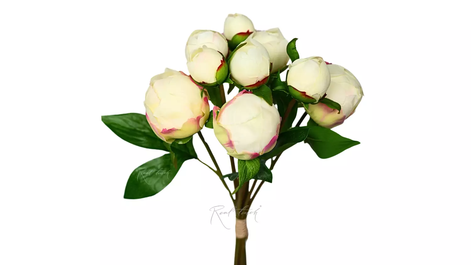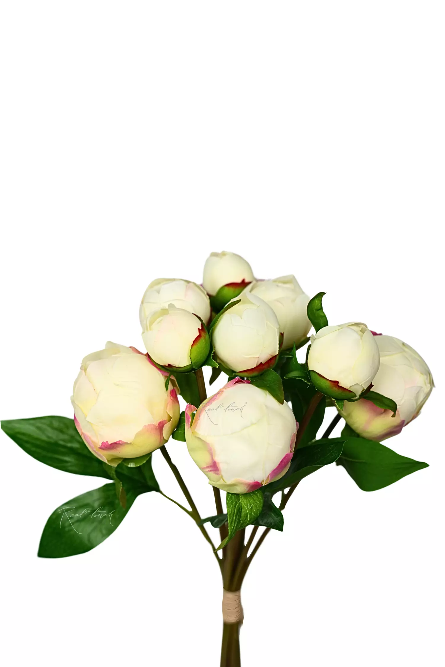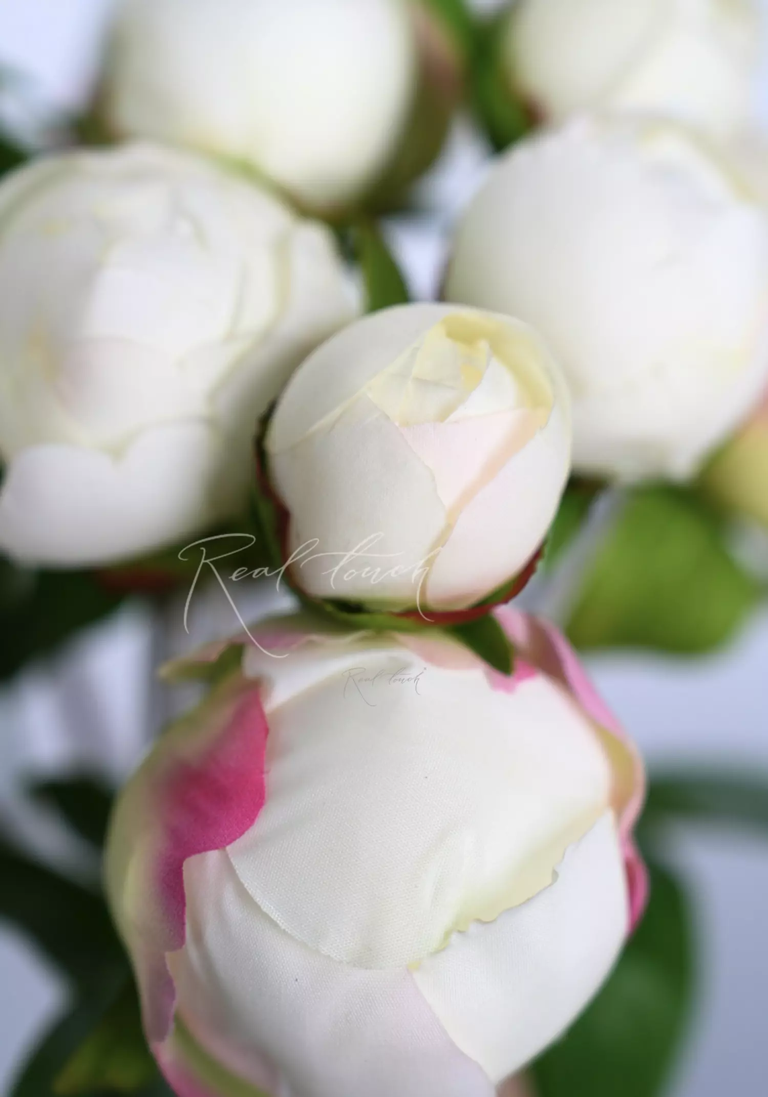 Букет закрытых пионов представлен в ассортименте Real Touch в трех нежных цветах: кремовый, бело-розовый и темно-розовый.