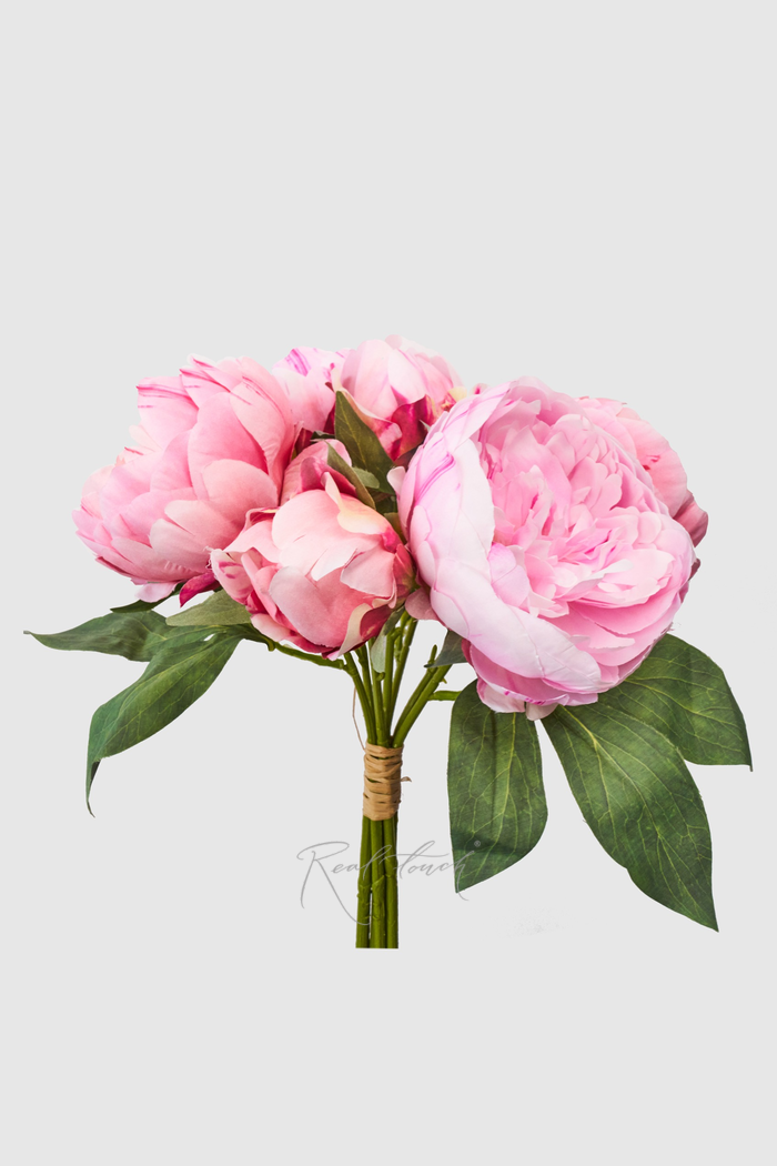 UV-защита. Букет состоит из 5 больших светло-розовых цветков и 2 бутонов с тщательно прокрашенными лепестками, с прорисовокой деталей в виде вертикальный полос вдоль лепестков. Материал соцветий и листьев - текстить. Высота букет - 35см, его диаметр - 28см. Для того, чтобы пионы расправились, после транспортировки рекомендуем отпарить букет. Лепестки на ощупь такие же тонкие и мягкие, как настоящие, создавая невероятно реалистичное визуальное и тактильное восприятие.