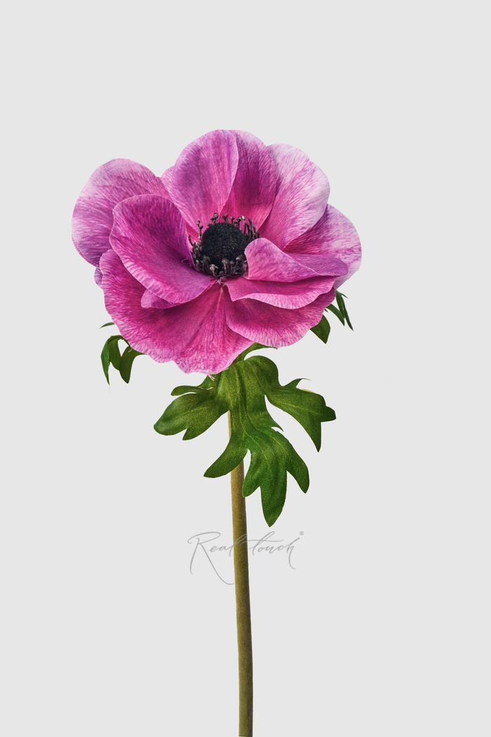 Яркие и неповторимые анемоны снова в ассортименте Real Touch. Новый вид создан из легкого и нежного текстиля. Это идеальный выбор для тех, кто хочет создать летнее настроение в интерьере. Высота цветка 48см, диаметр бутона 12см. Стебель данного анемона достаточно толстый (порядка 1 см) и приятный на ощупь, словно махровый благодаря особому покрытию. Сердцевина черного цвета с ворсом, нанесенным методом флокирования. Благодаря такой сердцевине цветок контрастнее и, следовательно, выглядит значительно ярче и привлекательнее. Некоторые лепестки формованы, то есть на них есть бороздки с прожилками, и слегка подогнутые края. На ощупь они тонкие и невесомые, будто у настоящего соцветия