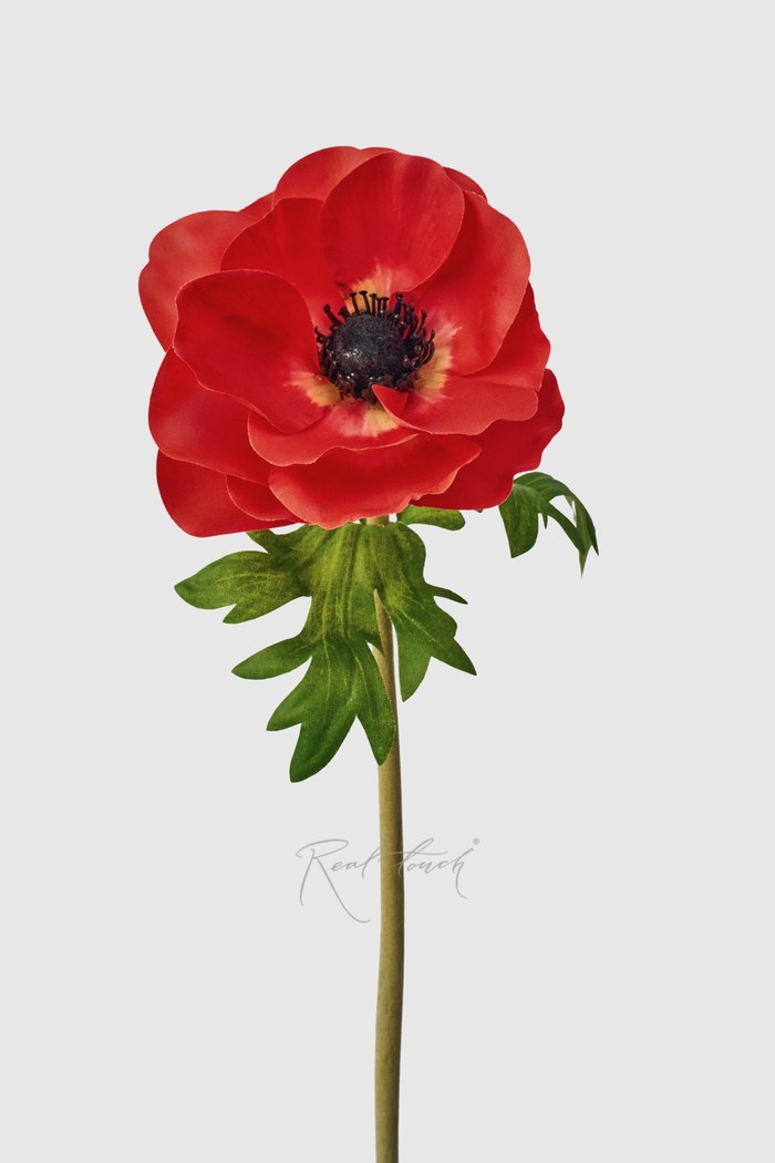 Яркие и неповторимые анемоны снова в ассортименте Real Touch. Новый вид создан из легкого и нежного текстиля. Это идеальный выбор для тех, кто хочет создать летнее настроение в интерьере. Высота цветка 48см, диаметр бутона 12см. Стебель данного анемона достаточно толстый (порядка 1 см) и приятный на ощупь, словно махровый благодаря особому покрытию. Сердцевина черного цвета с ворсом, нанесенным методом флокирования. Благодаря такой сердцевине цветок контрастнее и, следовательно, выглядит значительно ярче и привлекательнее. Некоторые лепестки формованы, то есть на них есть бороздки с прожилками, и слегка подогнутые края. На ощупь они тонкие и невесомые, будто у настоящего соцветия