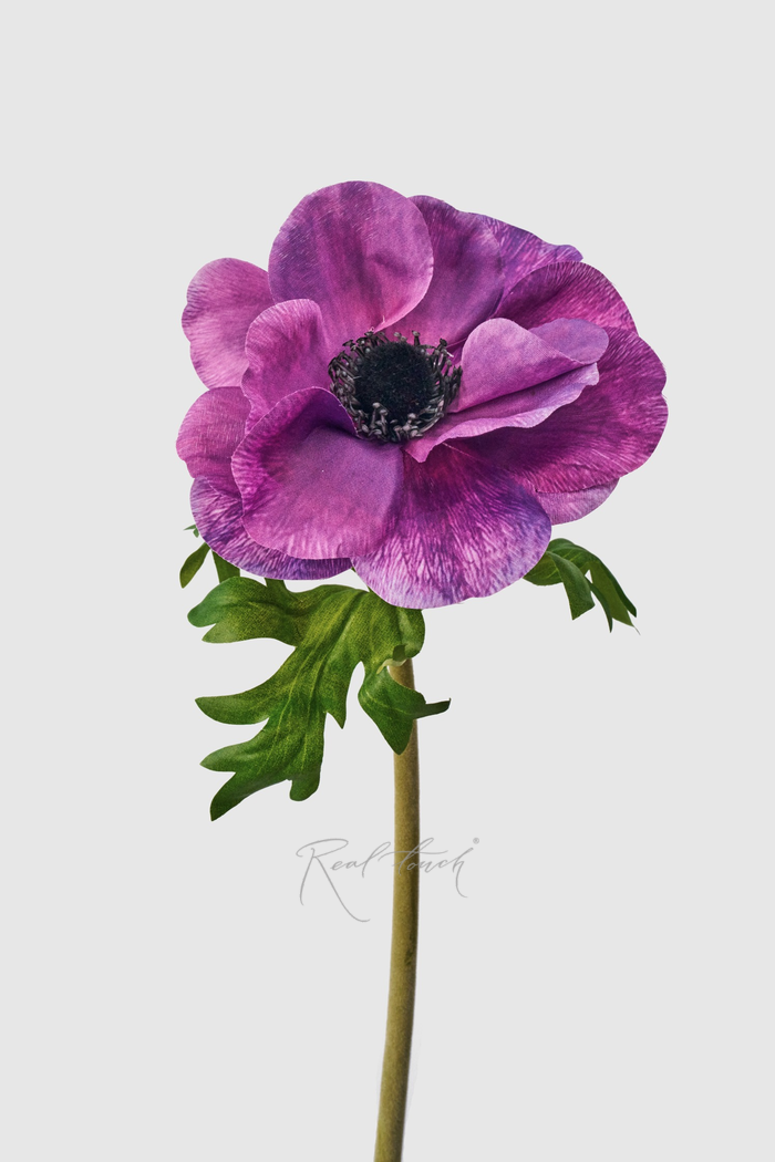 Яркие и неповторимые анемоны снова в ассортименте Real Touch. Новый вид создан из легкого и нежного текстиля. Это идеальный выбор для тех, кто хочет создать летнее настроение в интерьере. Высота цветка 48см, диаметр бутона 12см. Стебель данного анемона достаточно толстый (порядка 1 см) и приятный на ощупь, словно махровый благодаря особому покрытию. Сердцевина черного цвета с ворсом, нанесенным методом флокирования. Благодаря такой сердцевине цветок контрастнее и, следовательно, выглядит значительно ярче и привлекательнее. Некоторые лепестки формованы, то есть на них есть бороздки с прожилками, и слегка подогнутые края. На ощупь они тонкие и невесомые, будто у настоящего соцветия