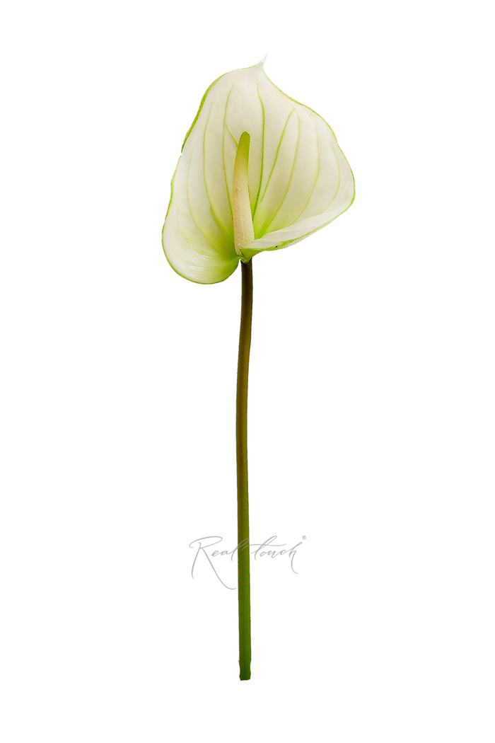 Антуриум - яркий, глянцевый, сияющий цветок в ассортименте Real Touch, который представлен в 6 цветах: белый, фиолетовый, бело-зеленый, зеленый, розовый, бело-розовый.