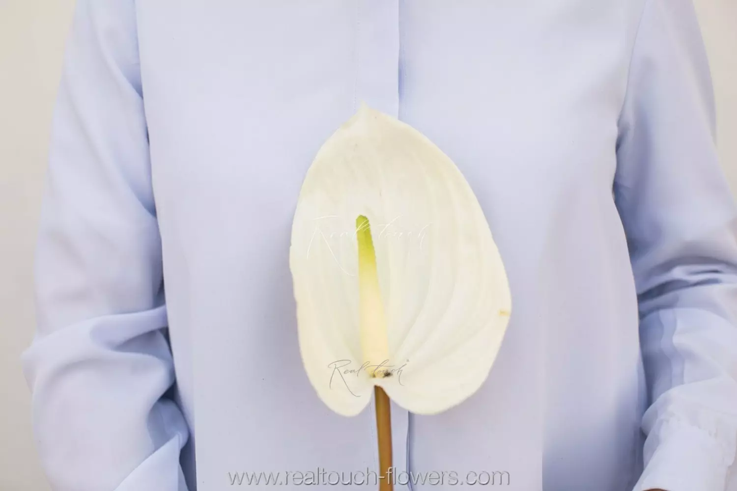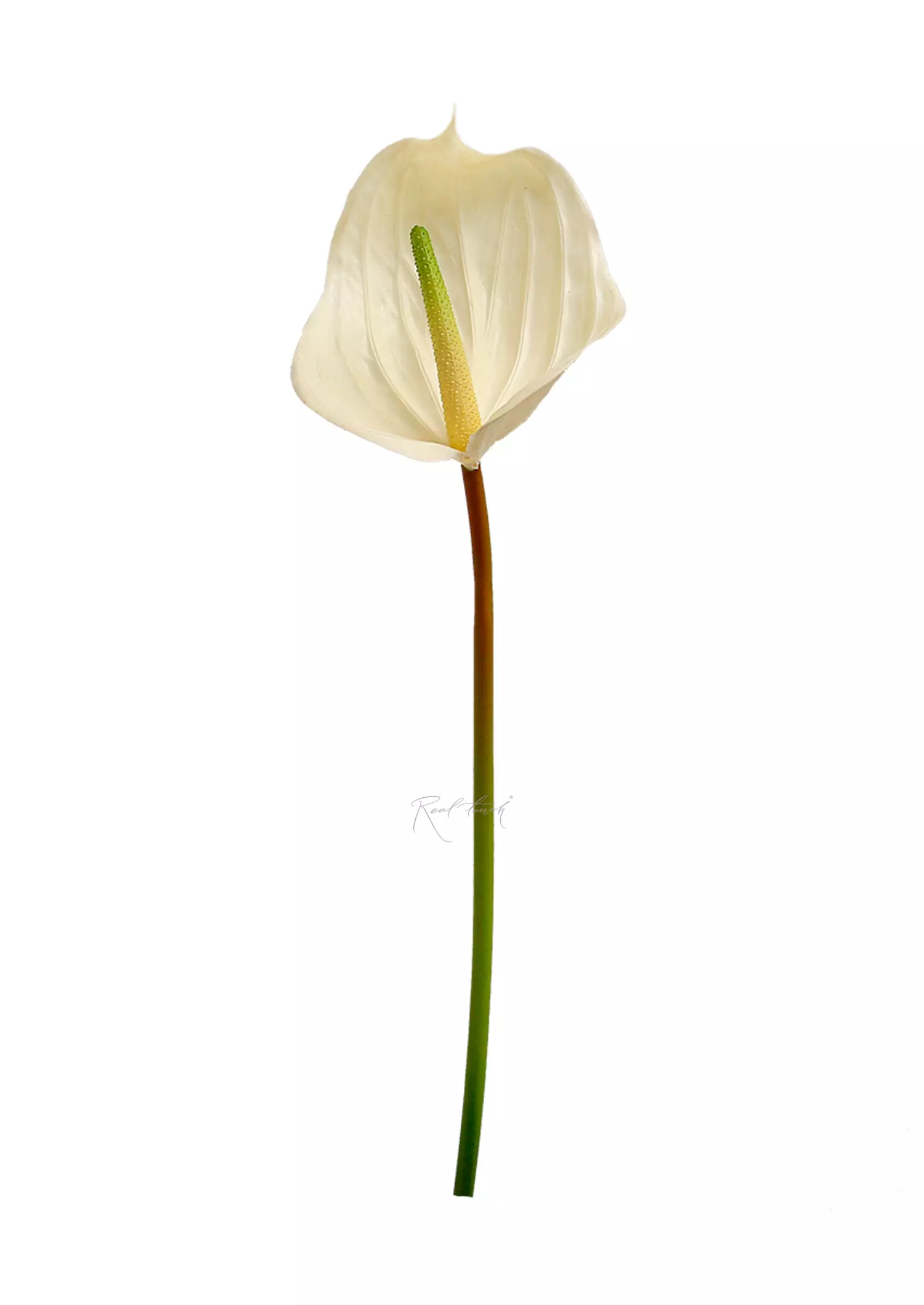 Антуриум - яркий, глянцевый, сияющий цветок в ассортименте Real Touch, который представлен в 6 цветах: белый, фиолетовый, бело-зеленый, зеленый, розовый, бело-розовый.