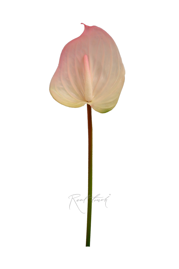 Антуриум - яркий, глянцевый, сияющий цветок в ассортименте Real Touch, который представлен в 6 цветах: белый, фиолетовый, бело-зеленый, зеленый, розовый, бело-розовый.