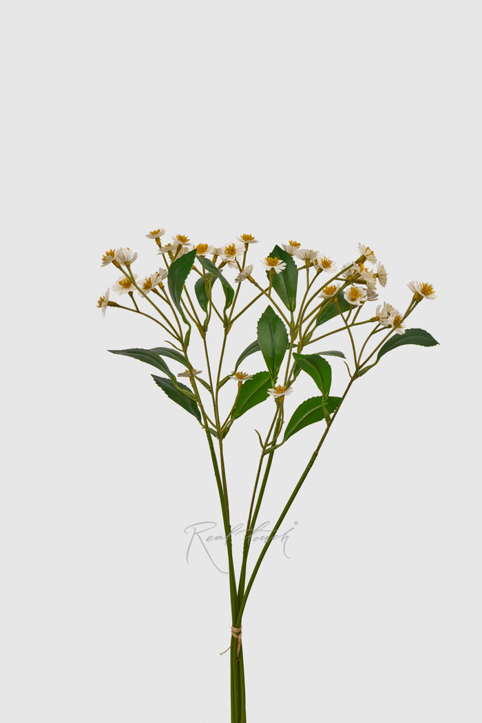 Букет состоит из 6 маленьких веточек с небольшими соцветиями ромашек. Каждая веточка имеет несколько ответвлений с небольшими цветочками. В ассортименте Real Touch можно найти 2 вида таких ромашек: с белыми и желтыми лепесточками. Высота букета 50 см. Лепестки и листочки ромашки выполнены из текстиля, а сердцевинки из пластика. Отлично смотрятся в большом количестве в монобукете. Добавьте немного летнего настроения в букеты и в свой интерьер.