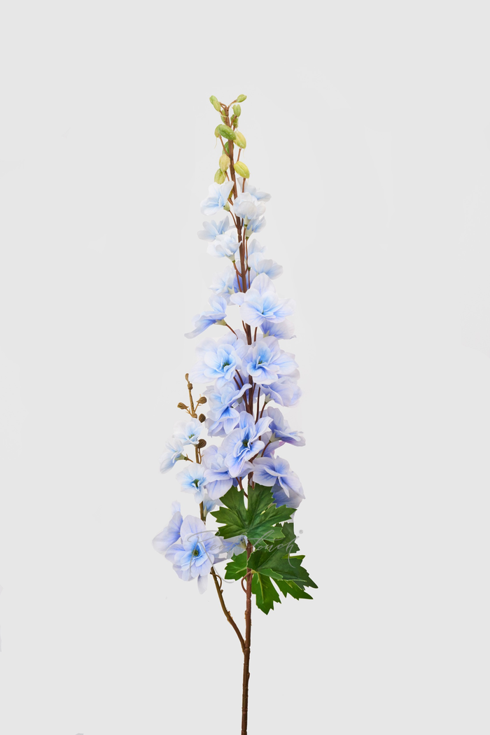 Стебель отличается бежево-коричневым оттенком, который подчеркивает природную эстетику растения. Листья выполнены из водонепроницаемого волокна насыщенного тёмно-зелёного цвета, с характерной для дельфиниума формой.