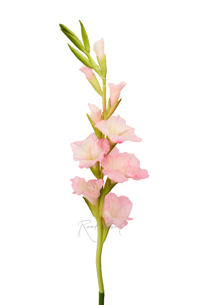 Элегантный гладиолус поражает своей реалистичностью: изящная композиция состоит из пяти полностью раскрывшихся бутонов и четырёх аккуратных бутонов в стадии цветения, выполненных из высококачественного силикона с точной передачей природной текстуры лепестков; прочный проволочный стебель обеспечивает удобство при создании цветочных аранжировок и позволяет легко моделировать желаемую форму, а продуманное сочетание раскрытых и закрытых цветков создаёт эффект естественного, постепенно распускающегося соцветия, что делает этот декоративный элемент идеальным выбором для оформления интерьеров, свадебных букетов и праздничных композиций