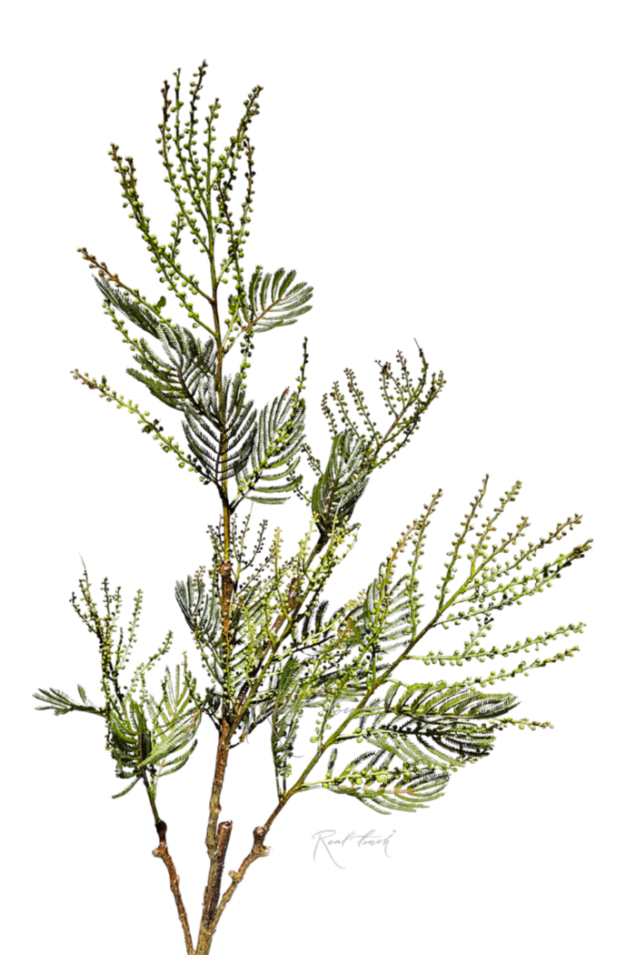Необычная ветка мимозы в трех размерах: 87см, 105см, 154см. Материал – пластик. Веточка очень объемная и очень искусно выполнена, с множеством мелких деталей: характерный листики, как у нашей альбиции, на каждой веточке закрытые бутоны мимозы светло-зеленого цвета. В основании каждой веточки есть проволока, поэтому расправить можно так, как вам нравится. Такая мимоза уникальная и подойдет как в напольную композицию, так и в зеленую стену.