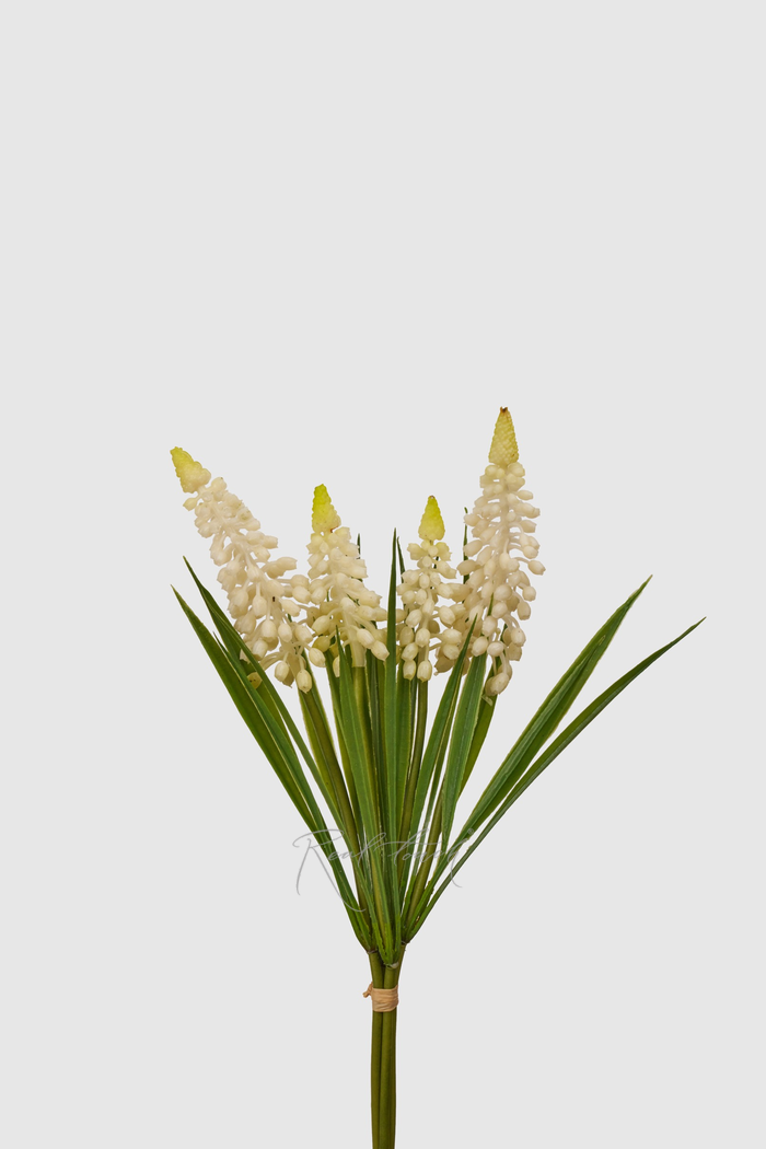 Мускари пучок — это изысканная композиция, состоящая из 4х нежных цветков белого цвета с тонкими, изящными листьями.