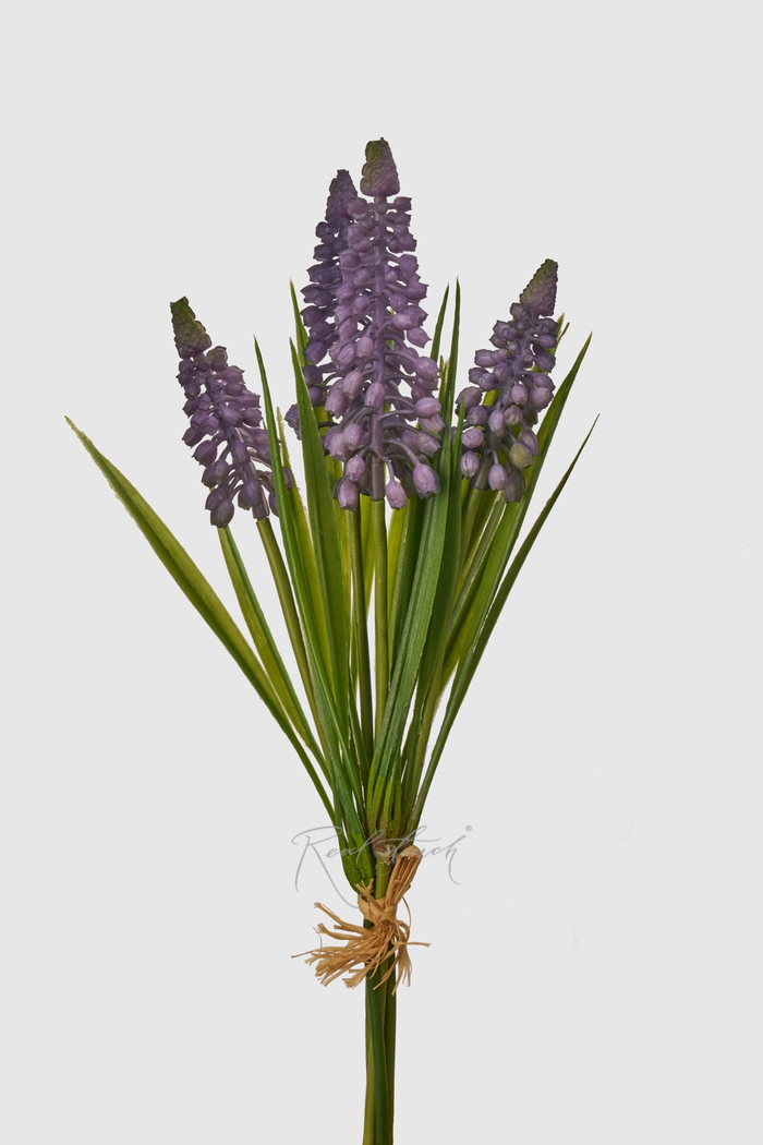 Метельчатые соцветия выполнены с высокой степенью детализации, передающей текстуру и градиент оттенков, характерный для настоящих мускари. Каждый цветок в пучке выглядит максимально реалистично, благодаря качественному материалу и продуманной форме.