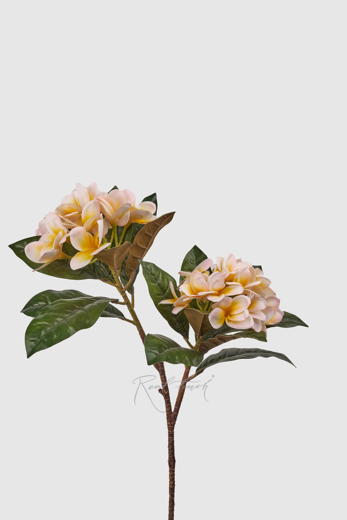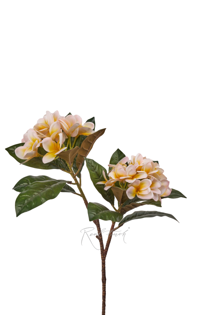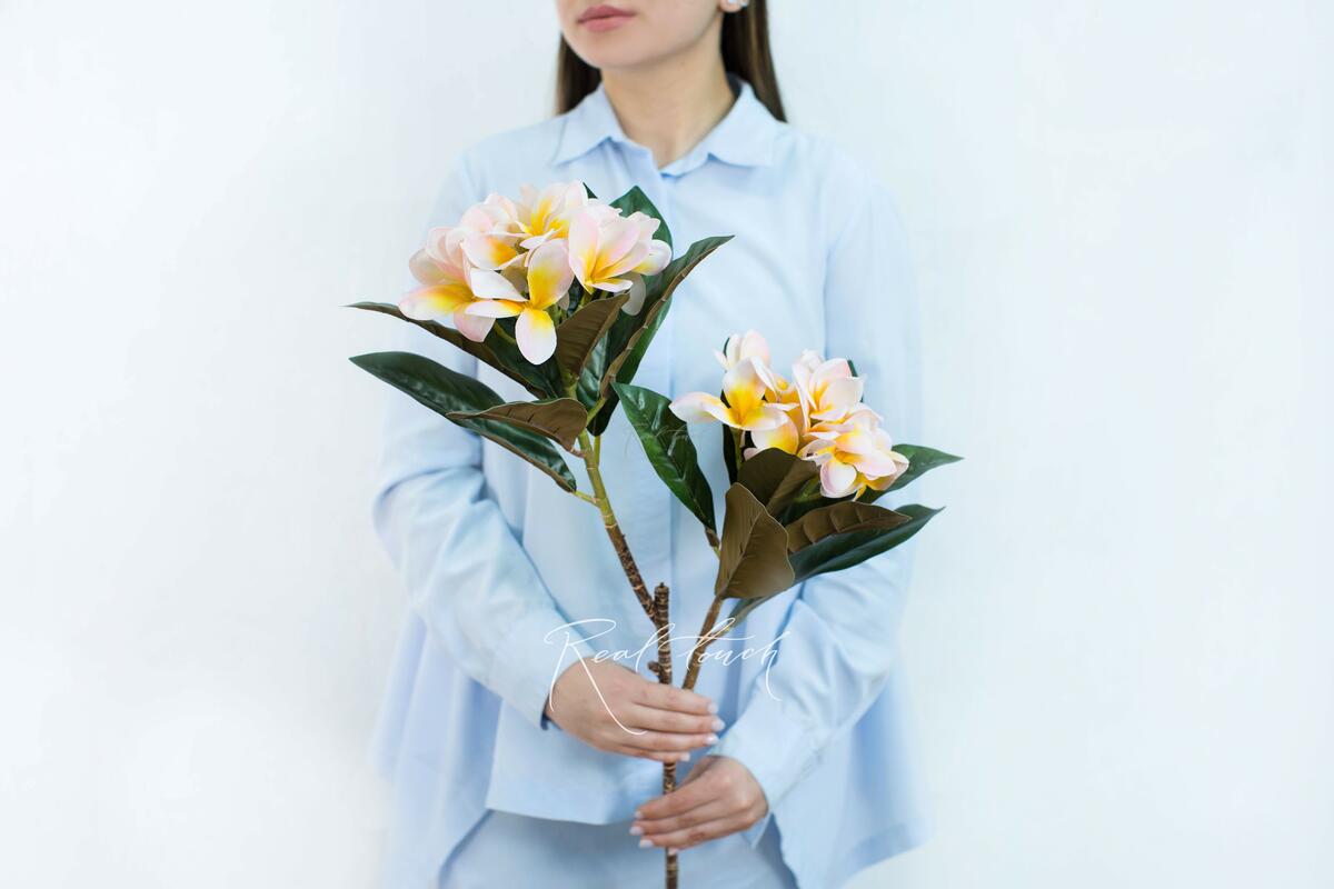 Плюмерия известная еще под одним названием - Франжипани, она является национальным цветком Лаоса и Бали. Теперь у нас также есть данный волшебный цветок! Состоит из 2 соцветий, похожих немного на шапки гортензии, листья темно-зеленые вверху и коричневые внизу, чем напоминают магнолию, стебель визуально похоже на ветку дерева, достаточно жесткий, рельефный, с хорошим окрасом. Соцветия большие (~8-20см после отпаривания), листья расположены плотно, они позволяют бутонам впечатлять за счет создаваемого контраста цвета в том числе. Высота ветки 83см. У нас в ассортименте сейчас два цвета – белый и нежно-розовый с желтой сердцевиной. Все же у данной модели есть нюансы: во-первых, соцветия на первый взгляд сидят достаточно плотно в креплении, но 1-2 цветочка могут выпасть, как у гортензии, в любом случаем мы будем стараться максимально проверять; во-вторых, соцветия не держат форму, как живой цветок, это обусловлено использованием силикона, тонкого и нежного, при этом материал матовый и мягкий. Тем нее менее, Плюмерия впечатляет и сильно отличается от привычных уже нам моделей!