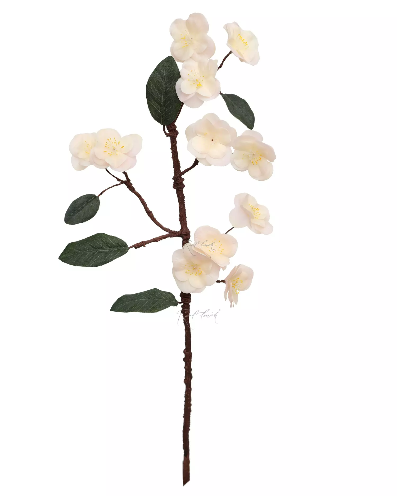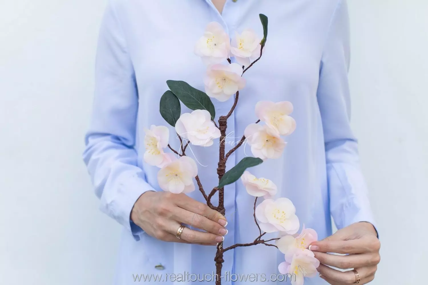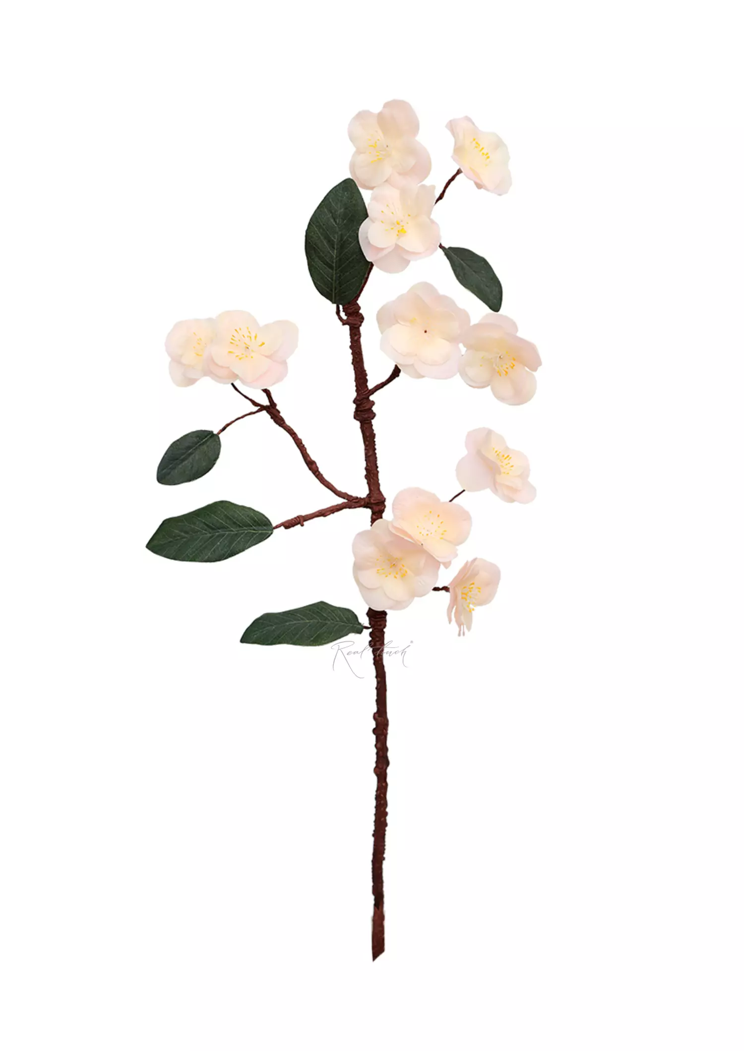 Она состоит из 4х основных ответвлений, украшенных великолепными соцветиями, выполненными из тонкого силикона с использованием 3D-печати прожилок, что придает лепесткам реалистичность. Окрас лепестков неоднородный, переходящий от светло-розового к белому, создавая ощущение естественного цветения. Внутри каждого соцветия находятся аккуратно проработанные тычинки, добавляющие детализации и глубины.