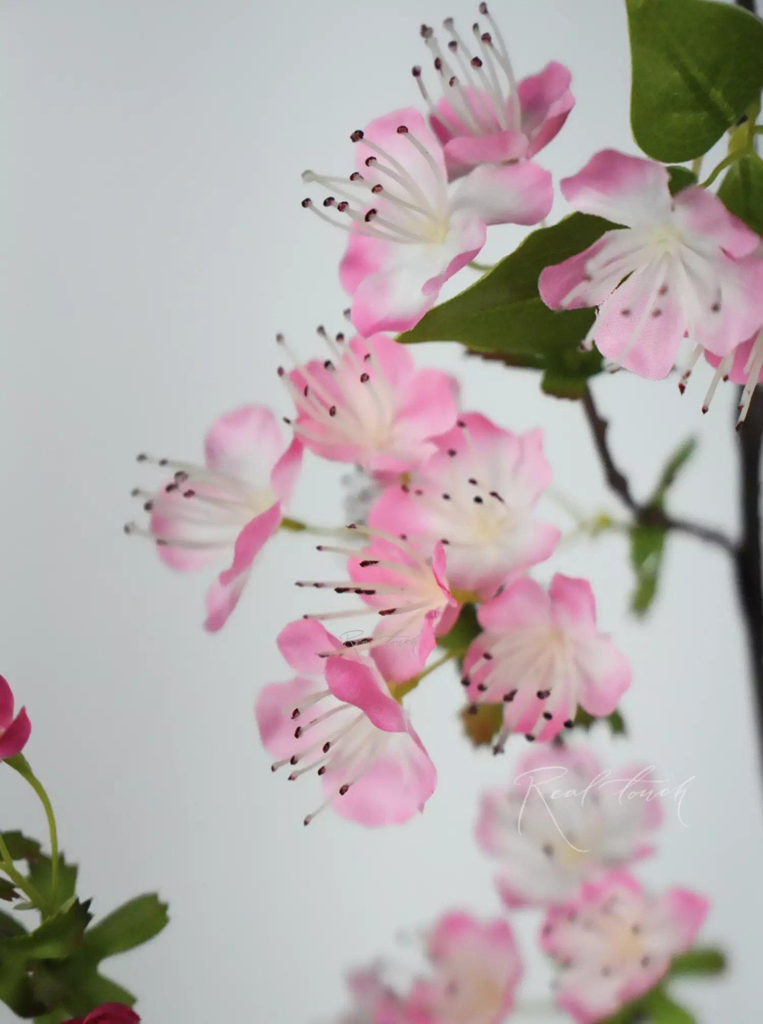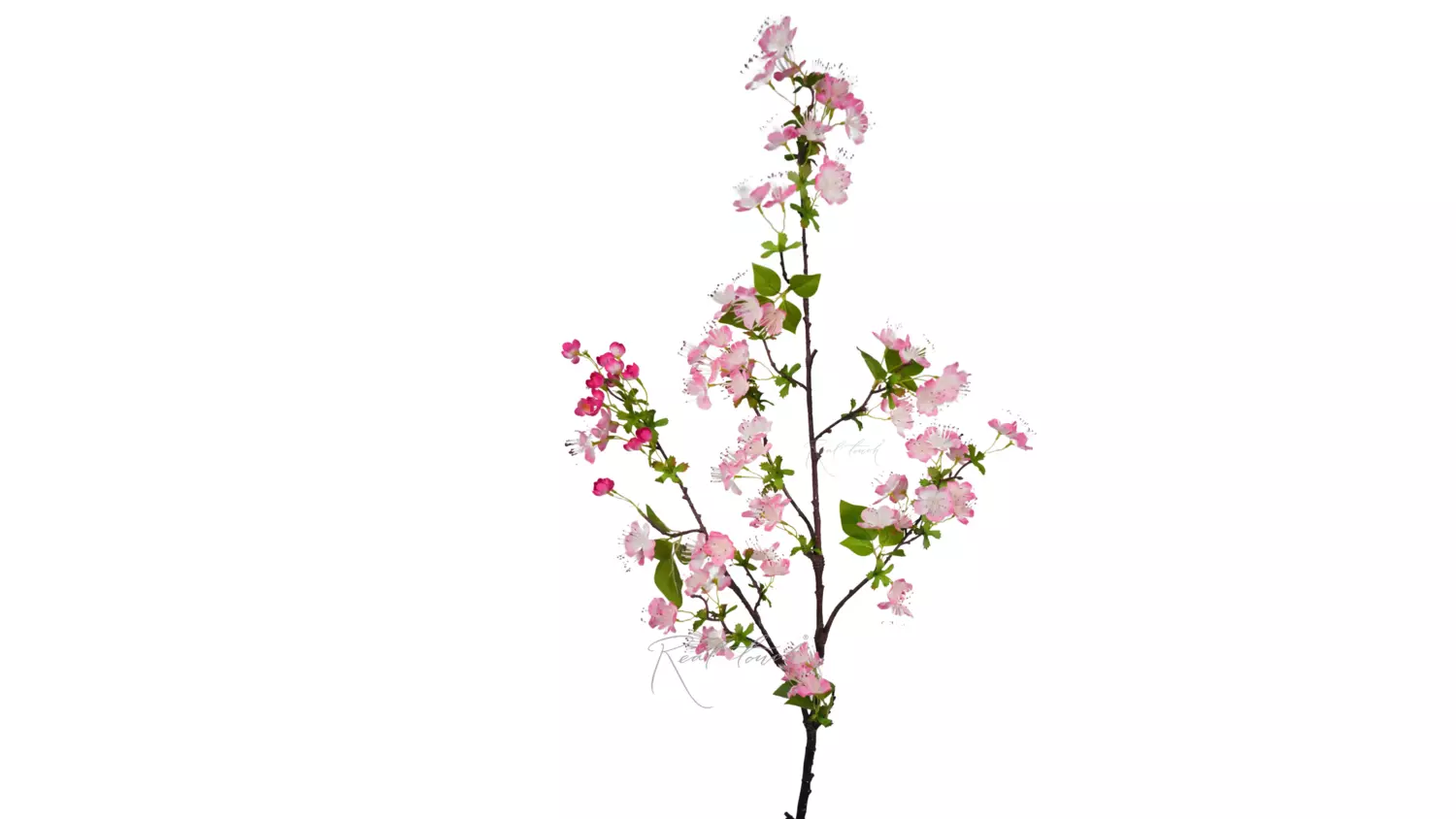 Ветка состоит из 1 большого ответвления и 5 поменьше, идущих из одной длиной ножки. По всей длине ответвлений - проволока, благодаря которой, ветка может принимать любые изгибы. Цветы выполнены из текстиля, листья частично из текстиля и водонепроницаемого материала. Стебель и ответвления выполнены из твердого пластика коричневого цвета с вкраплениями для иммитации структуры дерева.