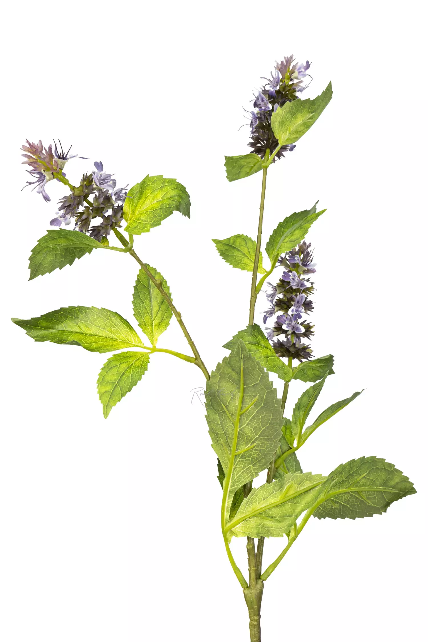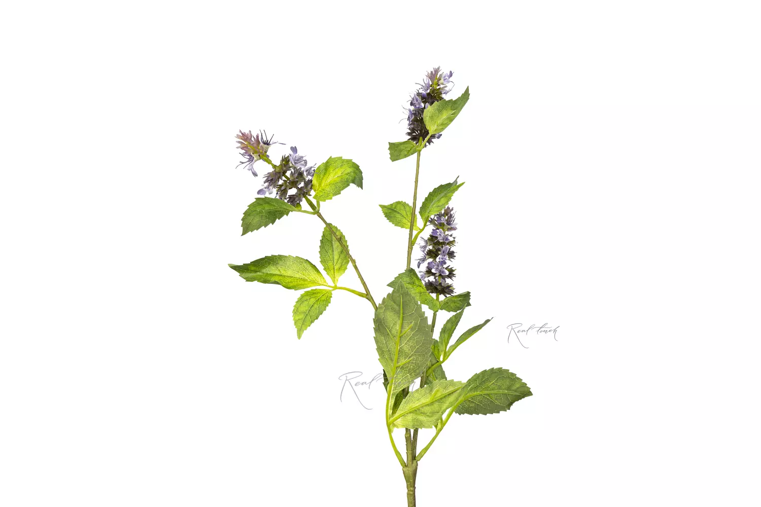 Веточка цветущей мелиссы имеет 3 основных ответвления, с нежными цветочками на концах и 2 ответвления с листьями. Листочки имеют градиентную заливку от светло-зеленого до зеленого, с текстурой выполненной при помощи 3D печати. Цветочки неоднородны и имеют множество мелких деталей.