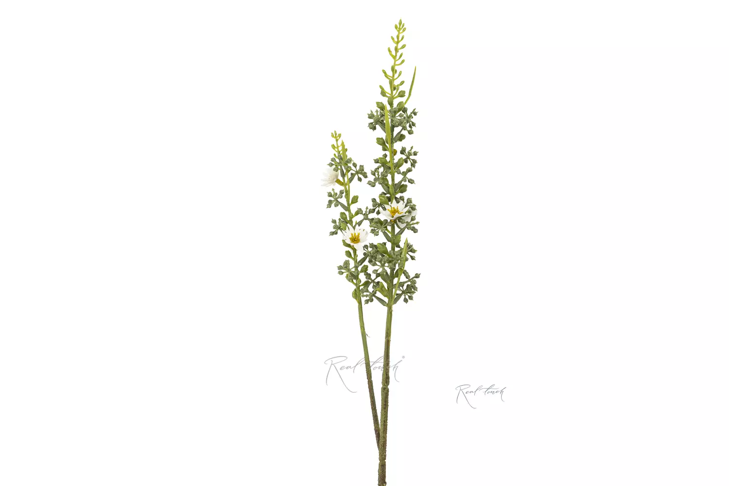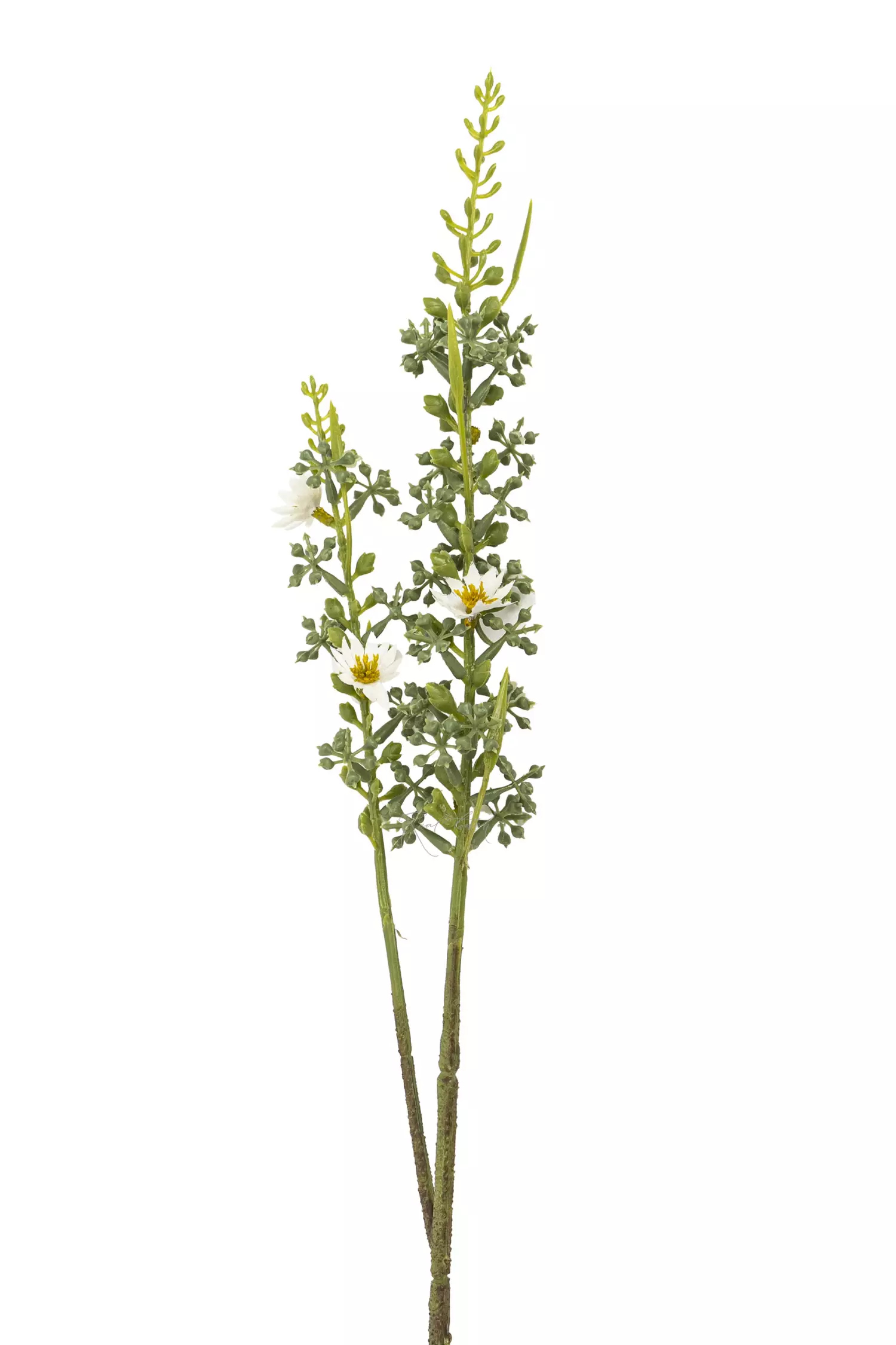 Звездочка с ягодами – веточка, длиной 60 сантиметров. Она сделана из пластика. Веточка имеет 2 ответвления, которые россыпью покрыты маленькими зелеными ягодками и белыми цветочками, с желтой сердцевиной. Окрас стебля неоднородный от темно-зеленого до светло-зеленого.