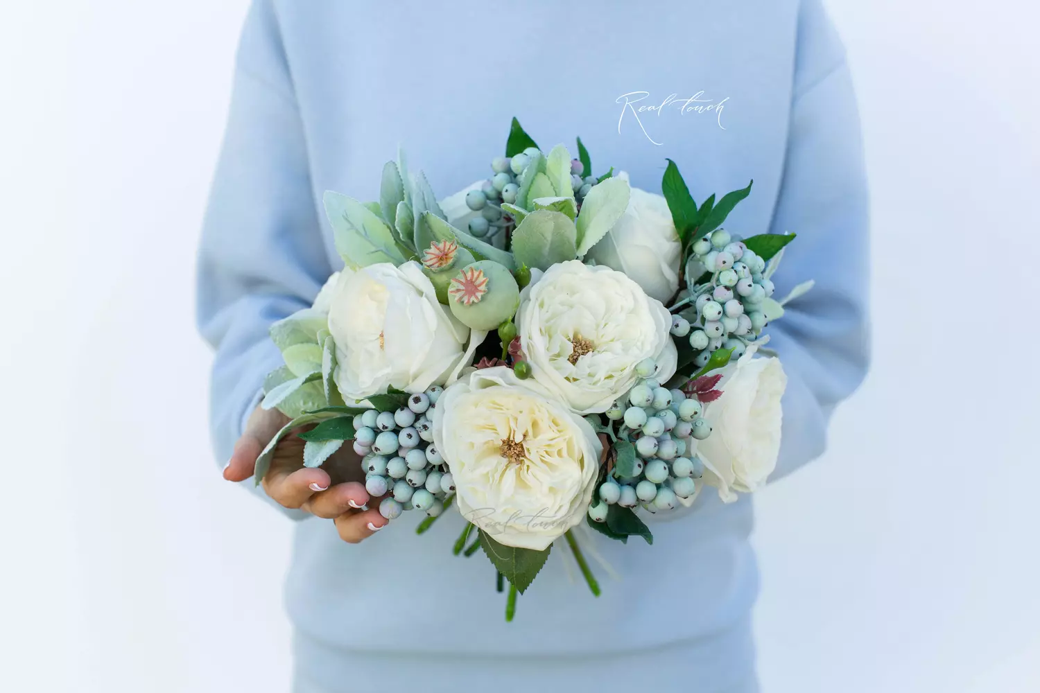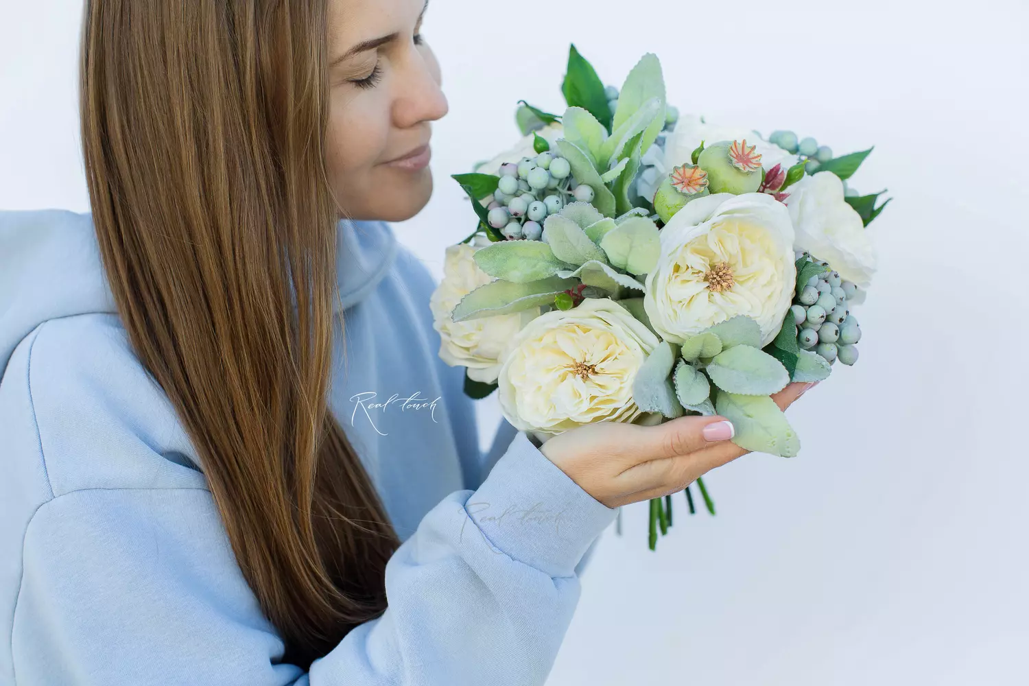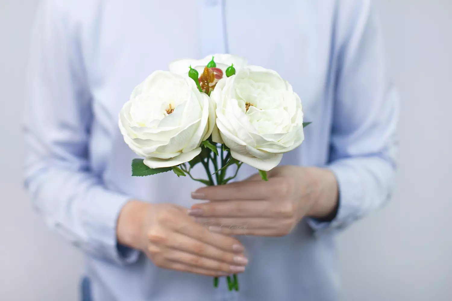 Букет состоит из 3-х роз, каждая диаметром 10см, высота бутона 6 см, диаметр букета 18-20см. Все, кто видел данный букет в полном от него восторге. Нежные лепестки слегка кремового оттенка, бархатистые, с идеальным изгибом и плотностью. Хочется вдохнуть аромат, даже зная о данном цветке немного больше других.