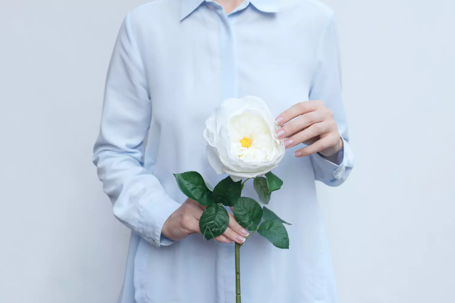 Пышный шарообразный бутон с чашевидной структурой и множеством изогнутых лепестков. Лепестки выполнены из шелка с латексным покрытием и с легкой формовкой, что придаёт цветку дополнительный объем и натуральность. Также лепестки выполнены с бархатистым напылением и передают максимальное сходство с настоящей розой при прикосновении.