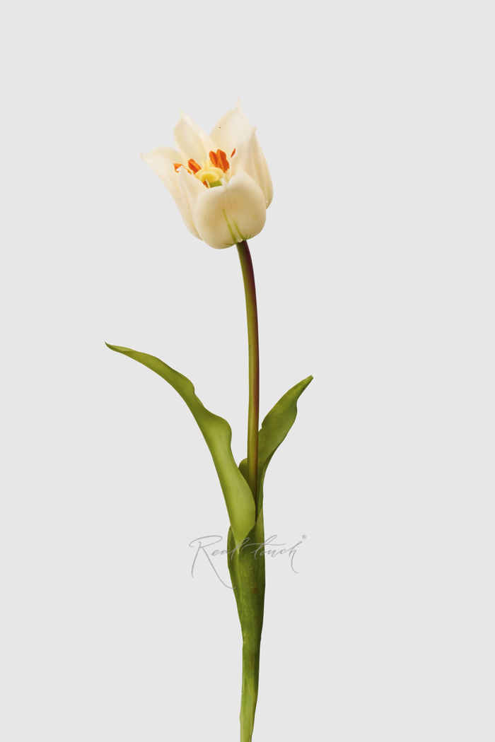 Белый тюльпан выполнен из плотного силикона, который имитирует тактильные ощущения от натурального цветка, даже листья «скрипят» точно так же. А градиент на лепестках повторяет природную расцветку.