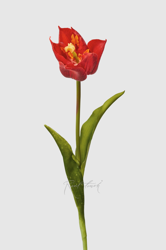 Красный тюльпан выполнен из плотного силикона, который имитирует тактильные ощущения от натурального цветка, даже листья «скрипят» точно так же. А градиент на лепестках повторяет природную расцветку.