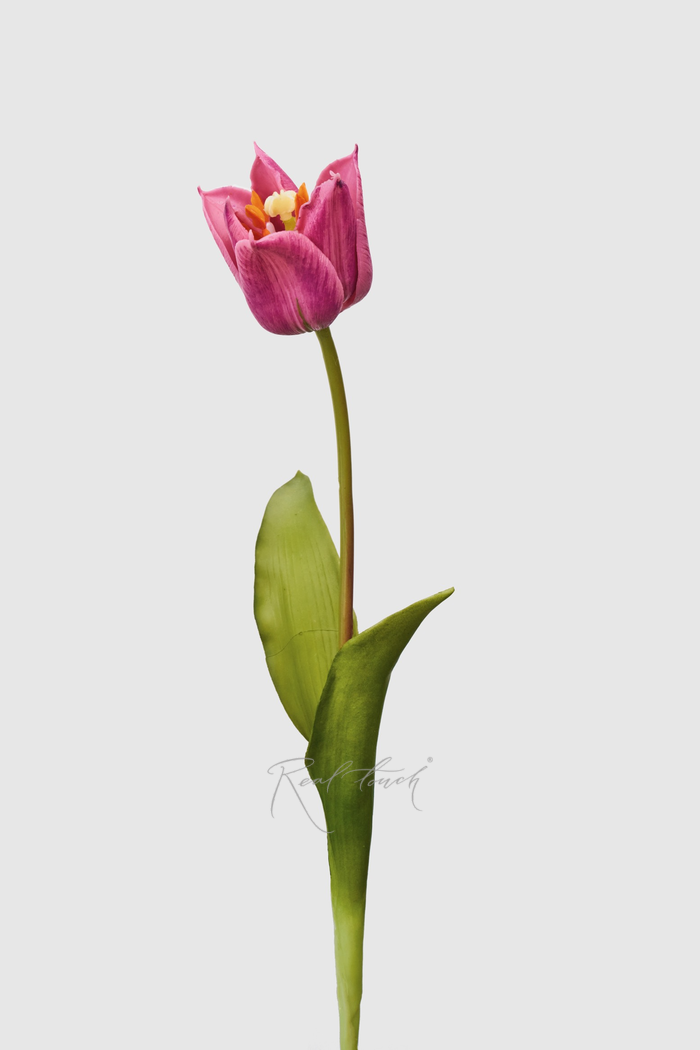 Лиловый тюльпан выполнен из плотного силикона, который имитирует тактильные ощущения от натурального цветка, даже листья «скрипят» точно так же. А градиент на лепестках повторяет природную расцветку.