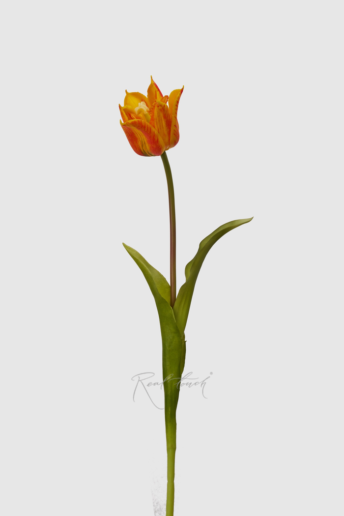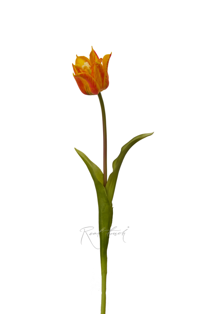 Оранжевый тюльпан выполнен из плотного силикона, который имитирует тактильные ощущения от натурального цветка, даже листья «скрипят» точно так же. А градиент на лепестках повторяет природную расцветку.