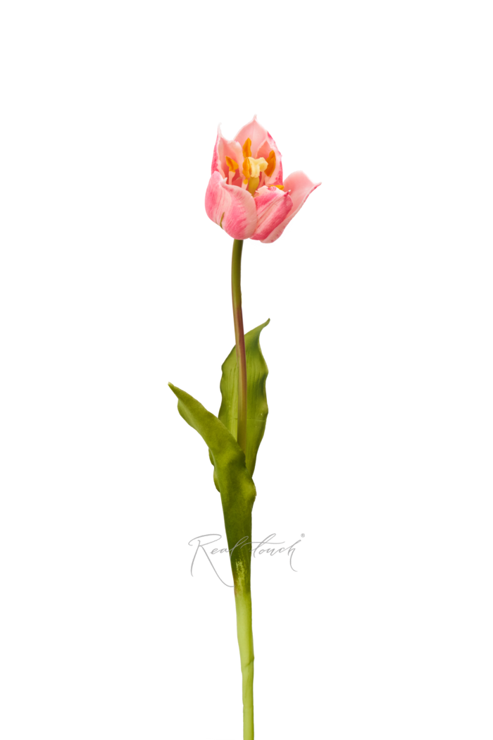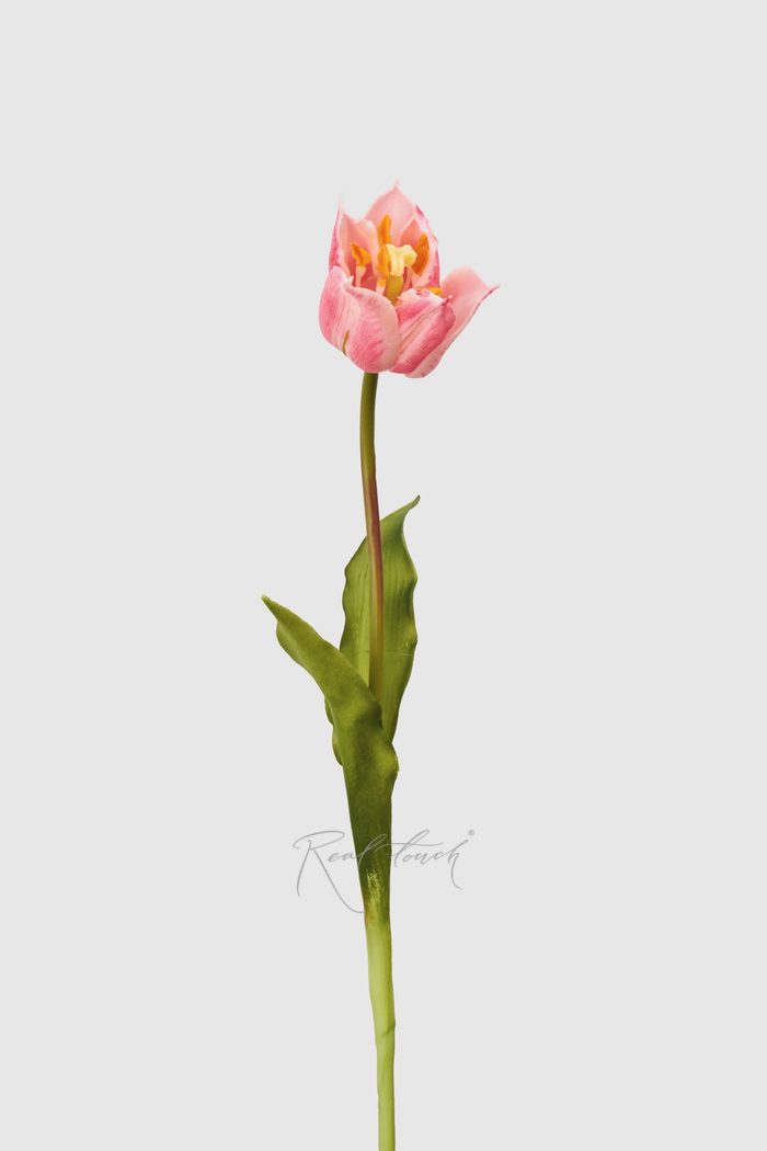 Розовый тюльпан выполнен из плотного силикона, который имитирует тактильные ощущения от натурального цветка, даже листья «скрипят» точно так же. А градиент на лепестках повторяет природную расцветку.