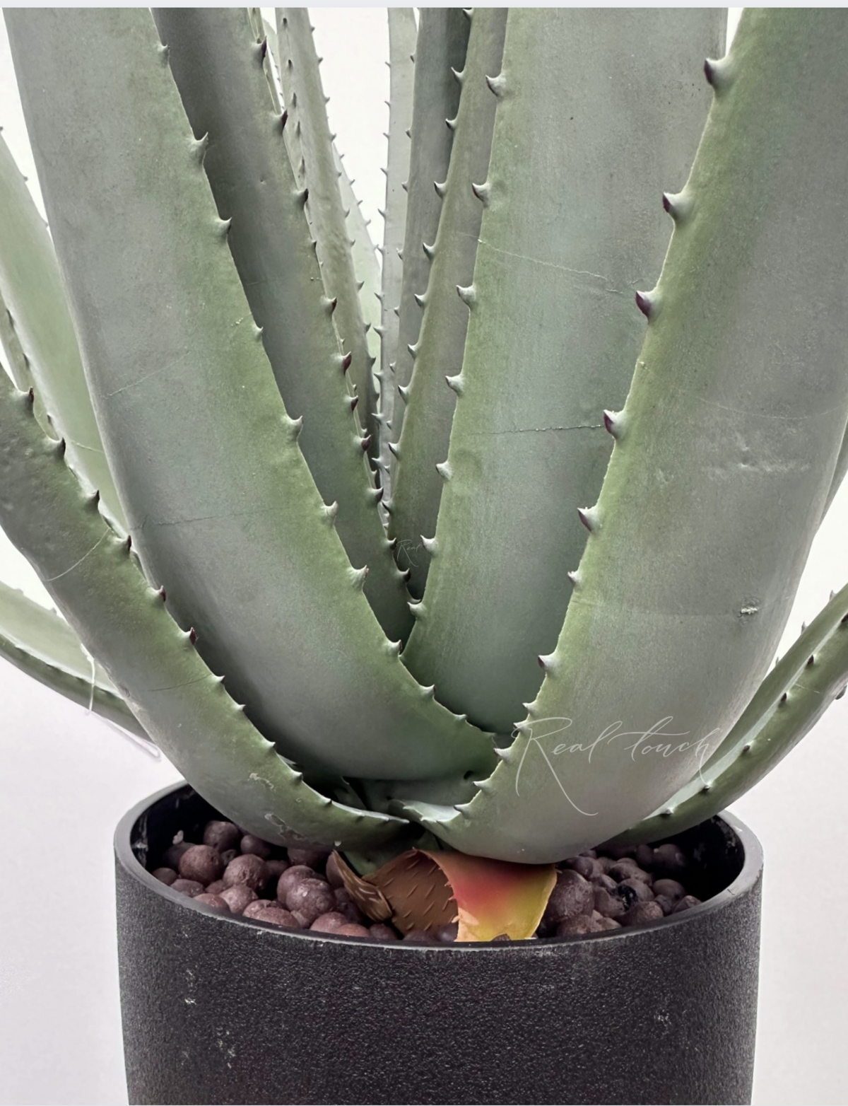 Листья изготовлены из плотного силикона, приятного на ощупь, с характерным игольчатым краем, присущим алоэ. Они имеют белое напыление, придающее им естественный матовый эффект. У основания листьев предусмотрена проволока, что позволяет легко регулировать направление и придавать растению желаемую форму.
