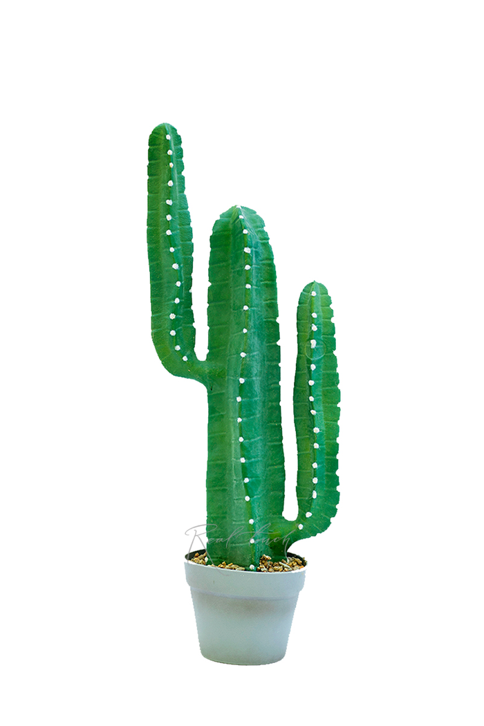 Пластиковый кактус с маленькими белыми иголками. Иглы больше похожи на ворсинки, так как сделаны из очень тонкого пластика. У этого кактуса один основной стебель с двумя ответвлениями. Надежно посажен в серый технический горшок. Части кактуса неразъемные. Доступен в трех размерах - 141/98/69см.